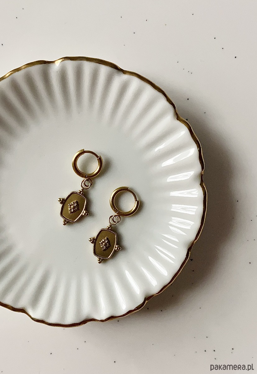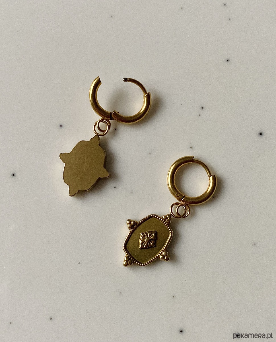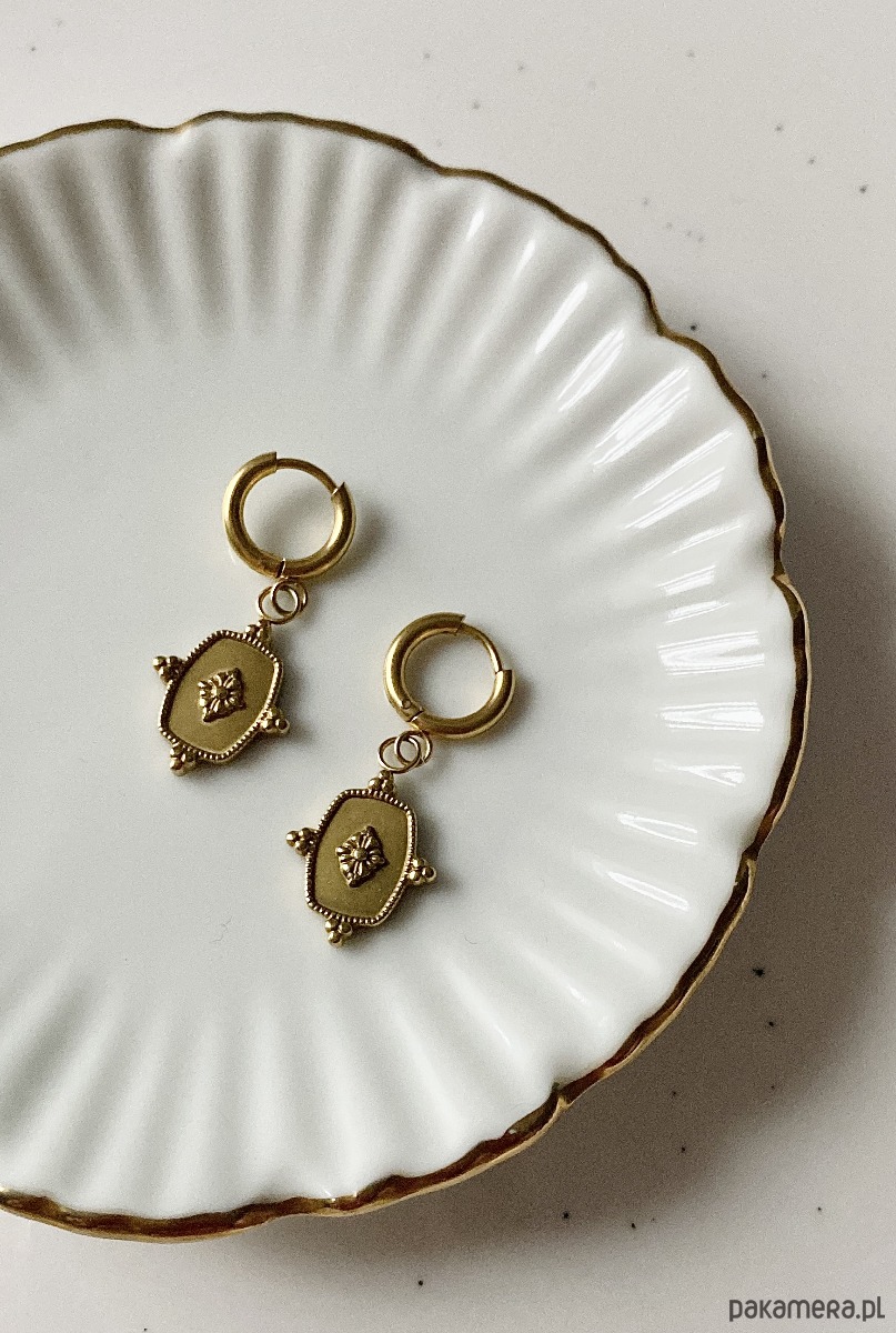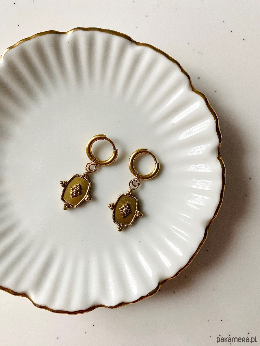 Piękne wiszące kolczyki wykonane ze srali chirurgicznej w kolorze złota, orientalny wzór i zdobienia nadają niezwykłego charakteru kolczykom.