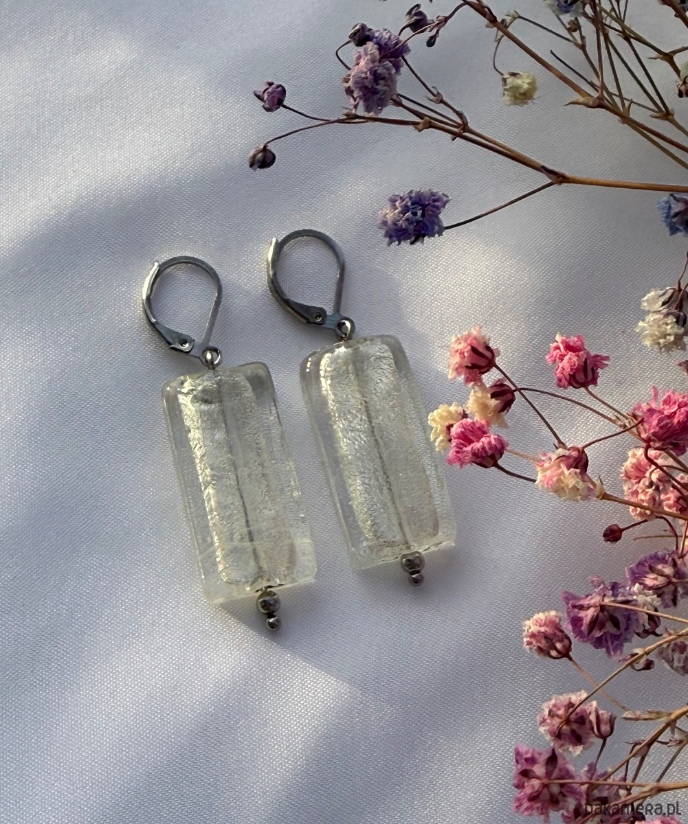 Ręcznie wykonane szklane elementy zachwycają subtelnym połyskiem i delikatną strukturą, która pięknie odbija światło, nadając biżuterii lekkości i klasy.