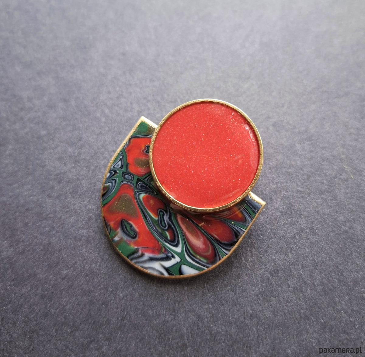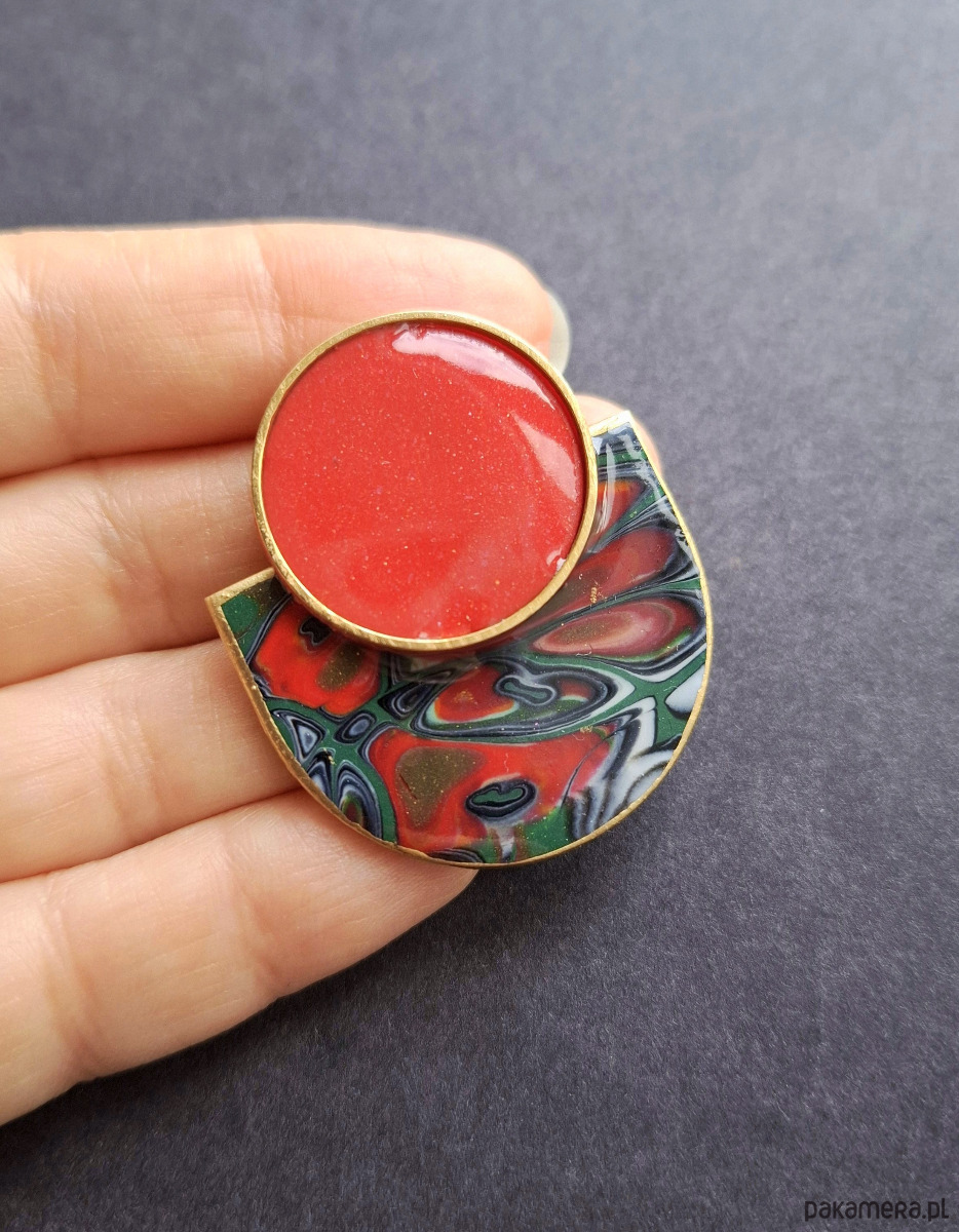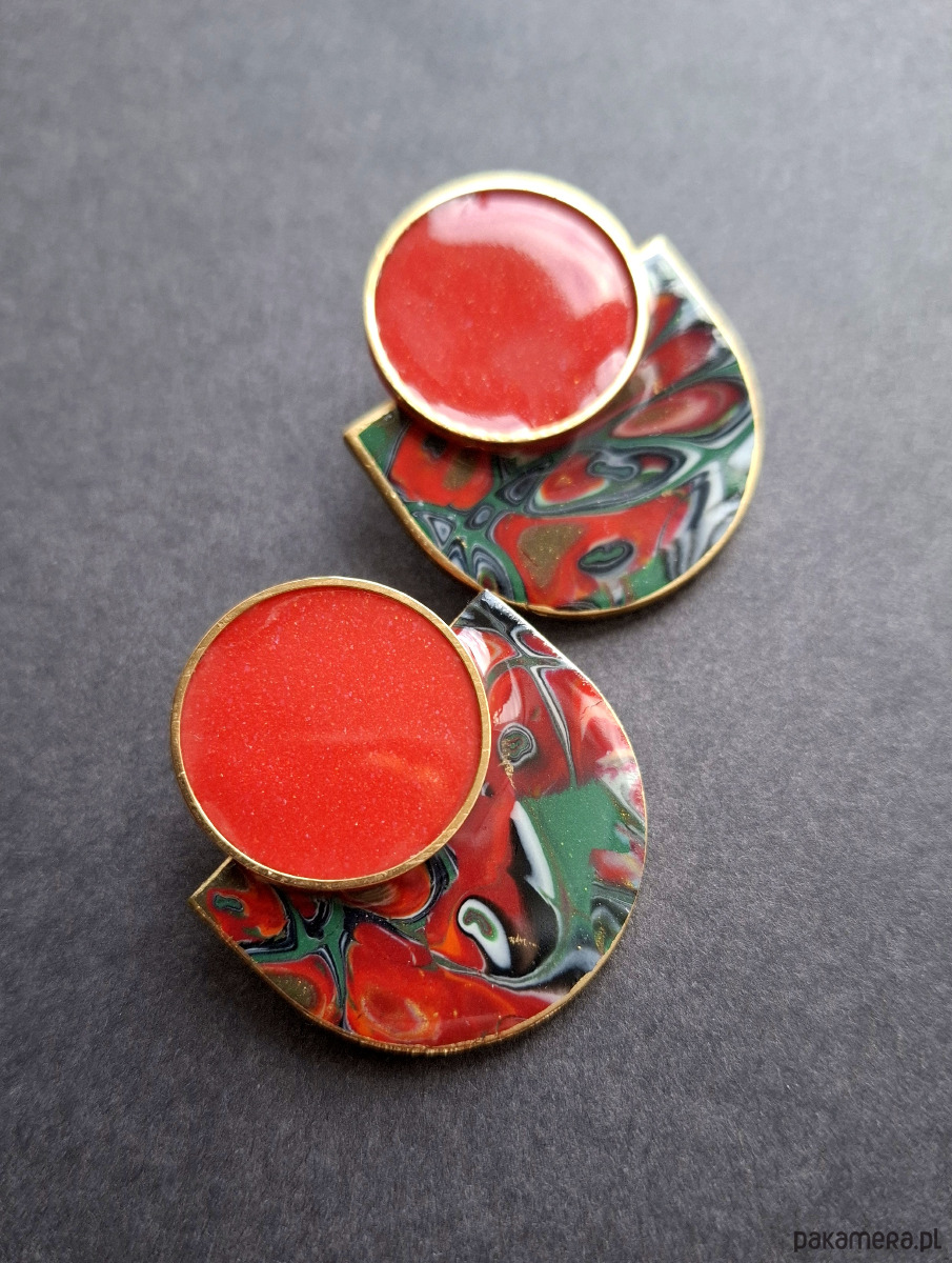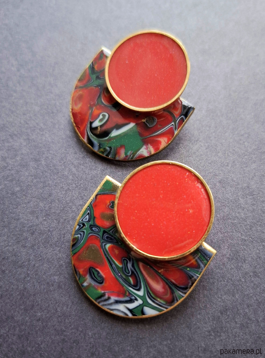 Kolczyki na sztyfty wykonane z wysokiej jakości glinki polimerowej z dodatkiem ozdobnych elementów metalowych. Jednostronne z pozłacanymi, nieuczulającymi sztyftami. Wymiary: długość wraz z zapięciem: 4,2 cm; szerokość max. 3,5 cm.