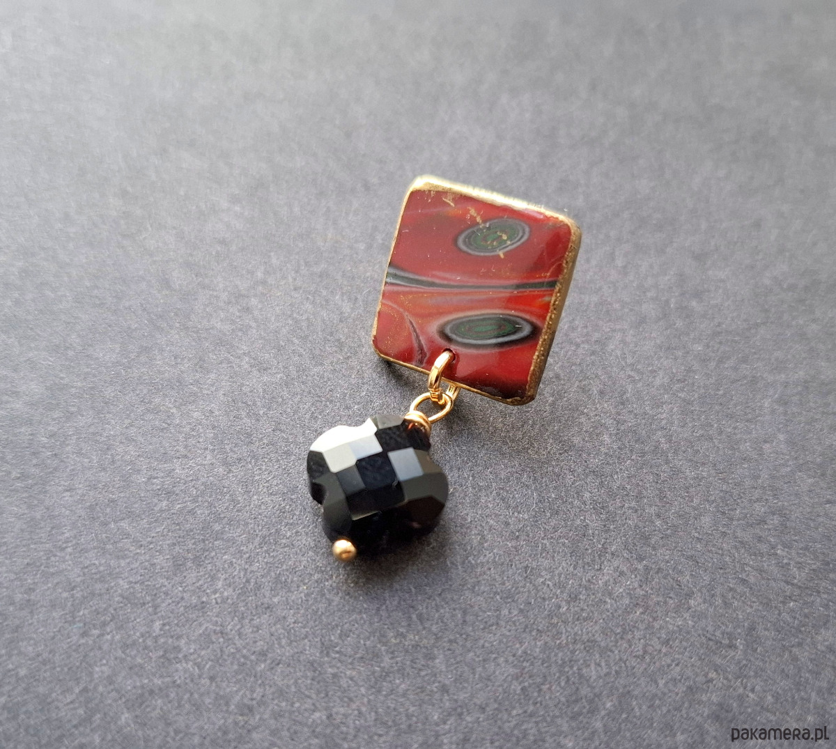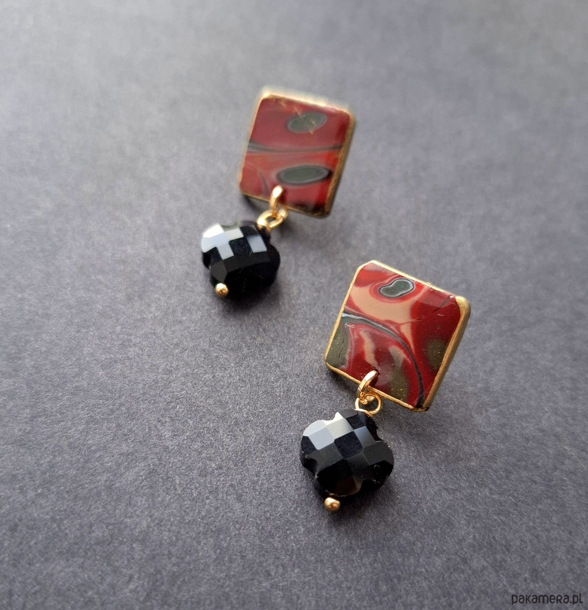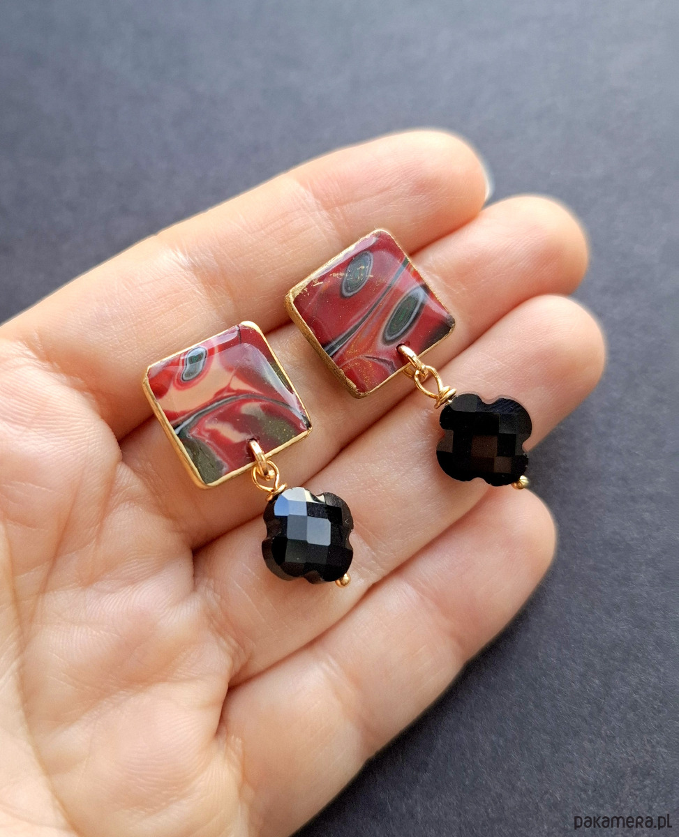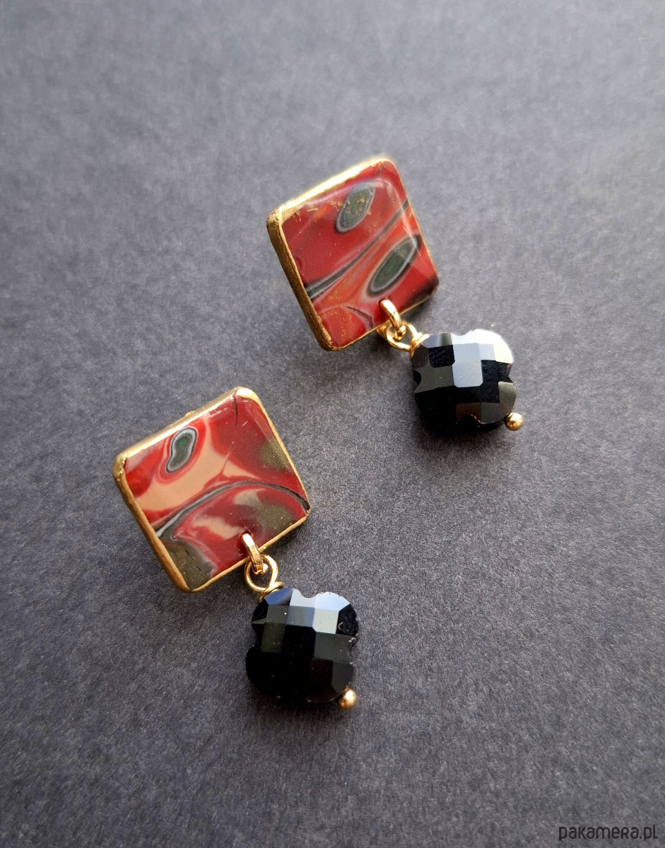 Kolczyki na sztyfty z podwieszonymi szklanymi koralikami, wykonane z wysokiej jakości glinki polimerowej. Jednostronne z pozłacanymi, nieuczulającymi sztyftami. Wymiary: długość wraz z zapięciem: 3,5cm; szerokość max. 1,5 cm. Wykonane w jedynym egzemplarzu.