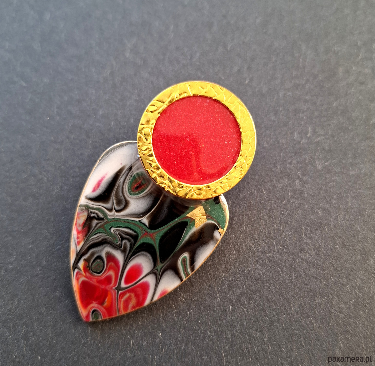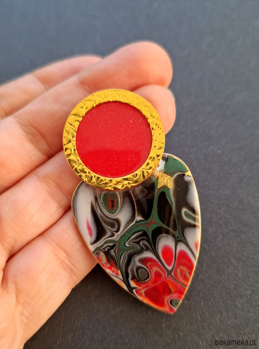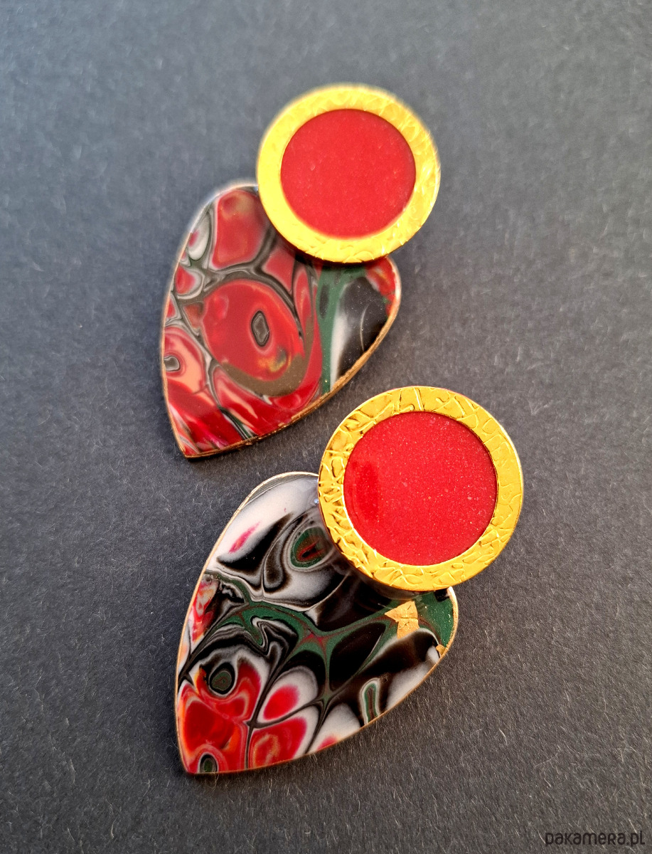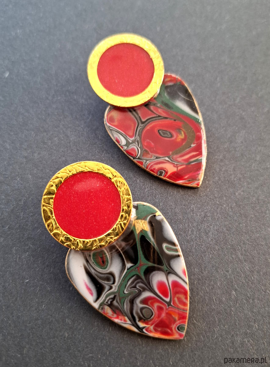 Kolczyki na sztyfty wykonane z wysokiej jakości glinki polimerowej z dodatkiem ozdobnych elementów metalowych. Jednostronne z pozłacanymi, nieuczulającymi sztyftami. Wymiary: długość wraz z zapięciem: 5,8 cm; szerokość max. 3,2 cm. Wykonane w jedynym egzemplarzu.