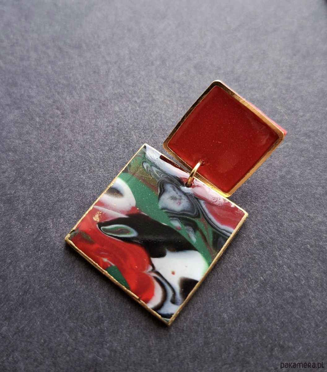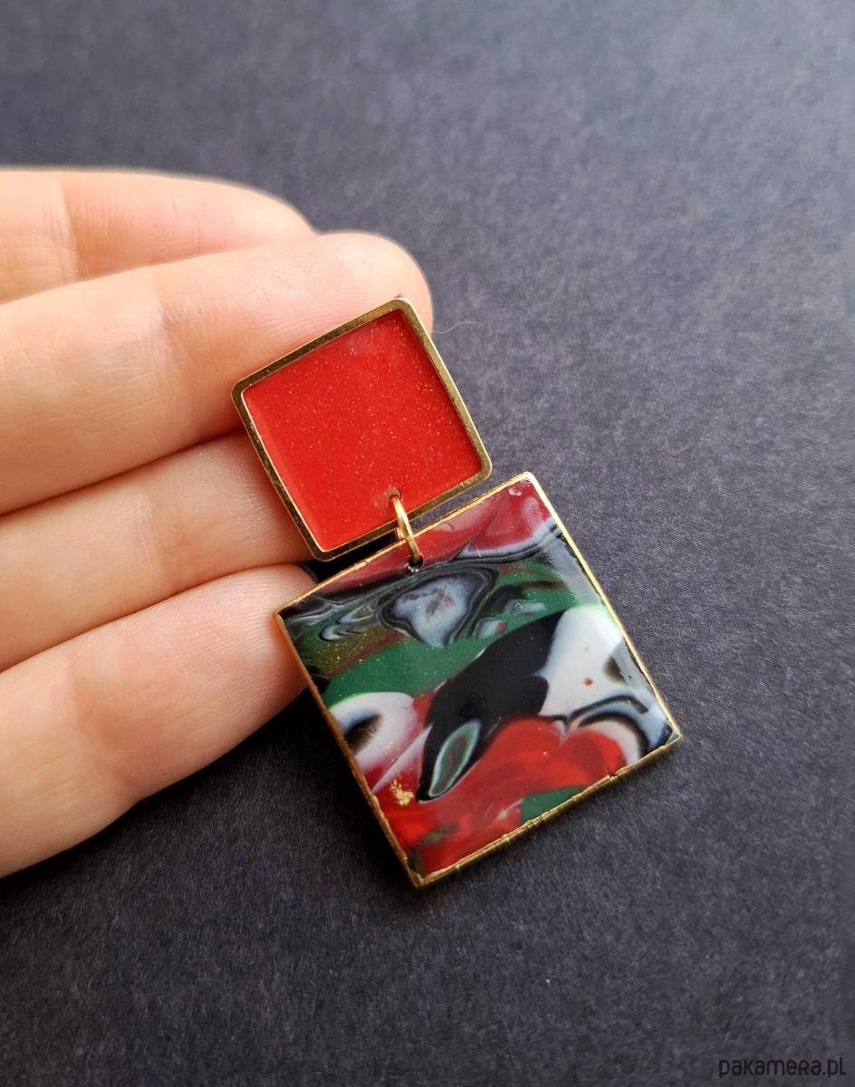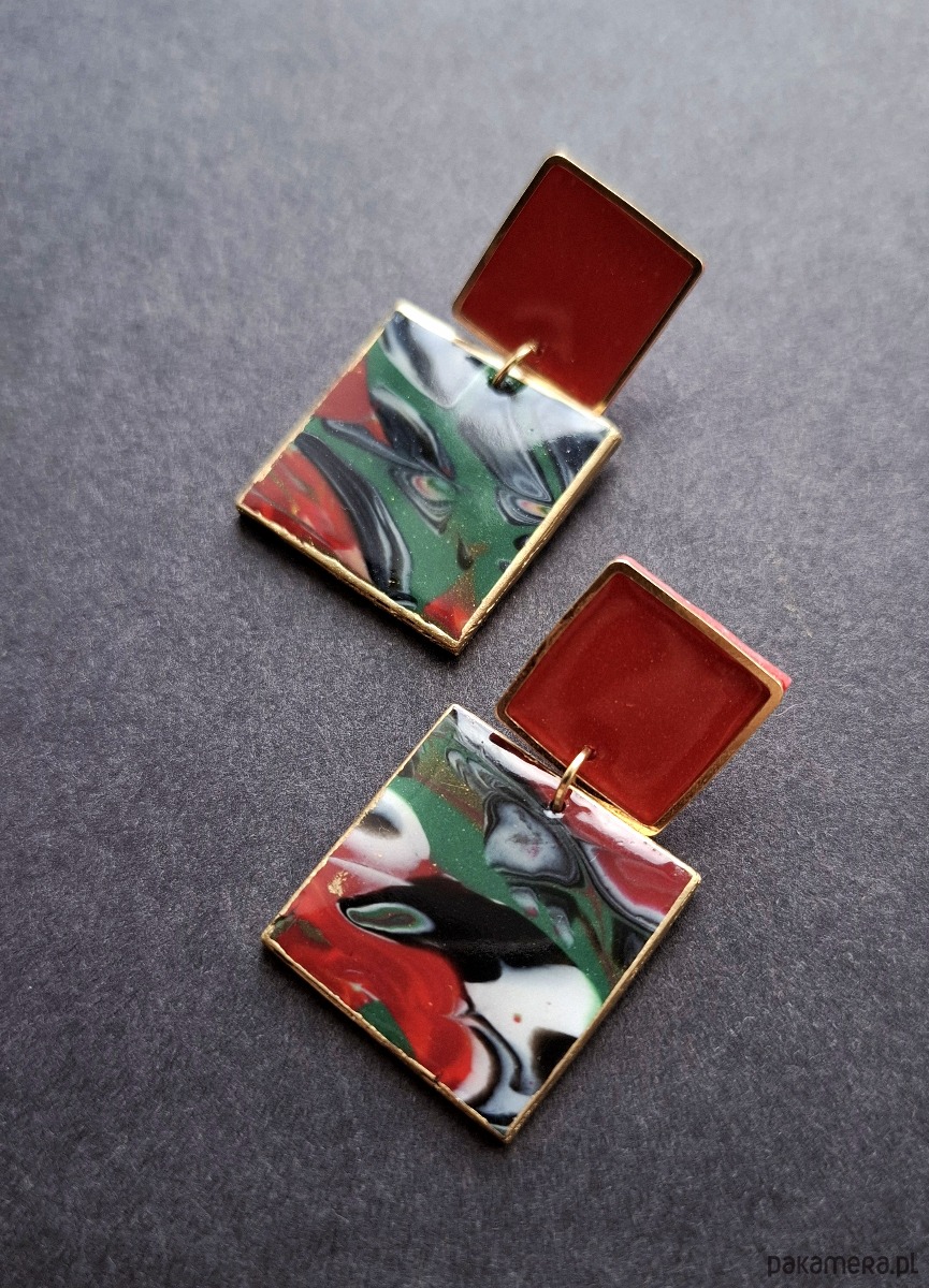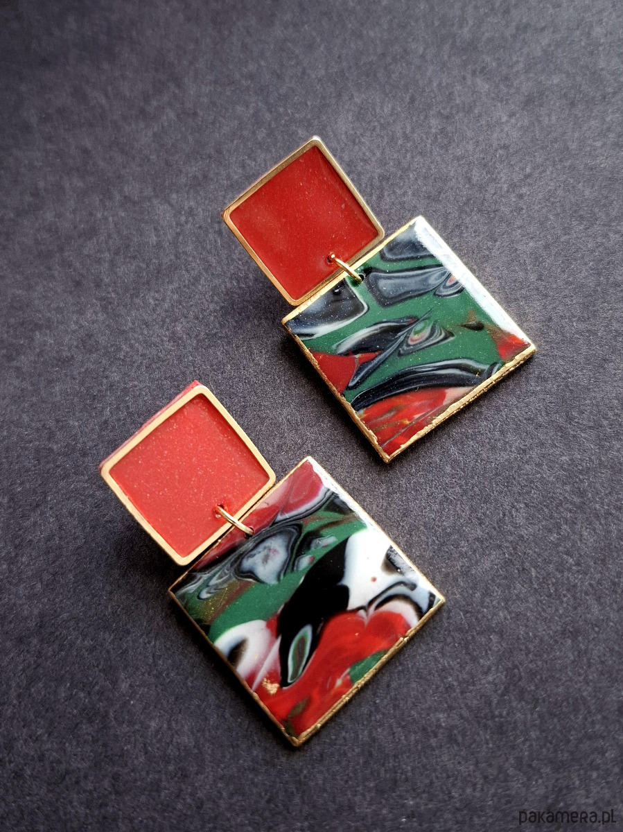 Kolczyki na sztyfty wykonane z wysokiej jakości glinki polimerowej z dodatkiem ozdobnych elementów metalowych. Jednostronne z pozłacanymi, nieuczulającymi sztyftami. Wymiary: długość wraz z zapięciem: 4,2 cm; szerokość max. 2,4 cm. Wykonane w jedynym egzemplarzu.