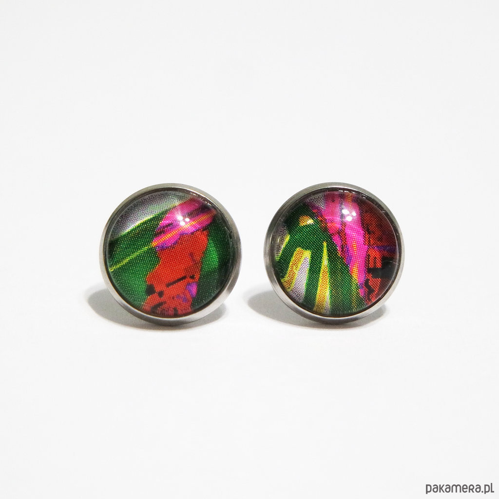 Grafika ukryta w prostych, eterycznych kolczykach, pod osłoną przeźroczystego półokrągłego szkiełka.