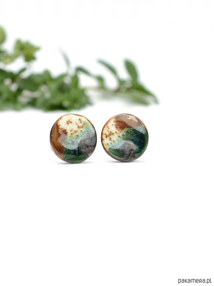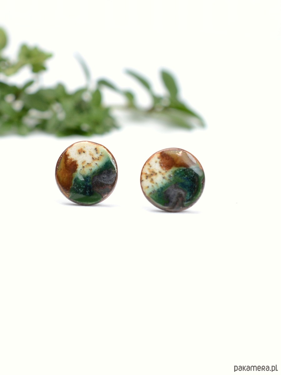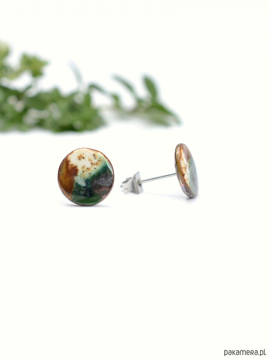 Kolczyki to ceramiczne kółeczka o średnicy 9mm i grubości 2mm. Elementy ozdobiłam mieszanką szkliw, które dały niepowtarzalny efekt przenikających się kolorów: beż, brąz, odcienie zieleni i grafit . Boczne krawędzie również są poszkliwione.