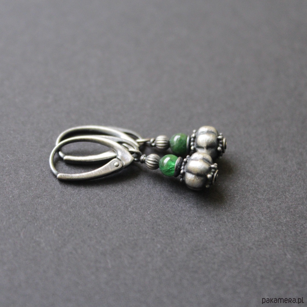 Głównym ozdobnikiem kolczyków jest srebrny ręcznie wykonany koral bali wielkości 0,8 cm w towarzystwie zielonego diopsydu o przepięknej barwie. Wielkość minerału wynosi 0,55 cm.