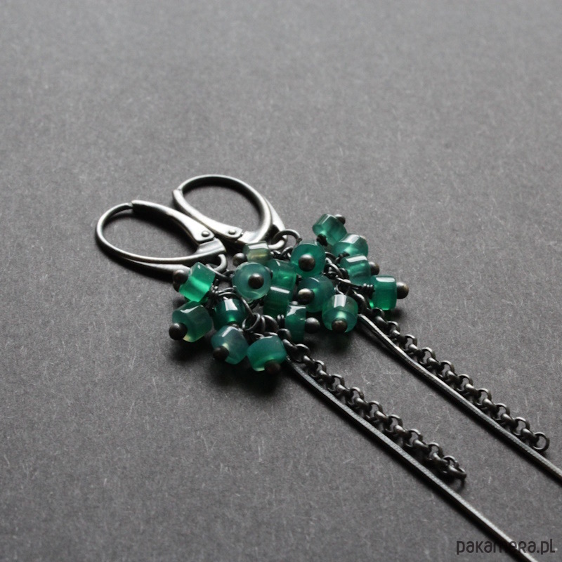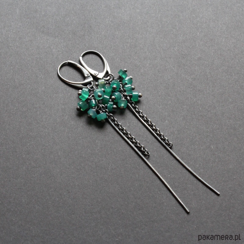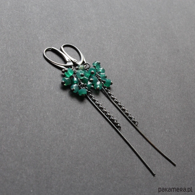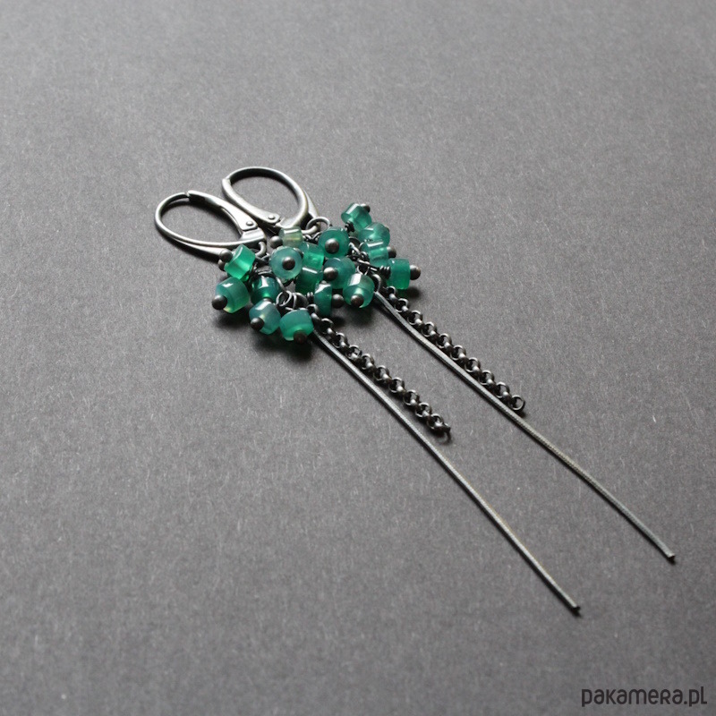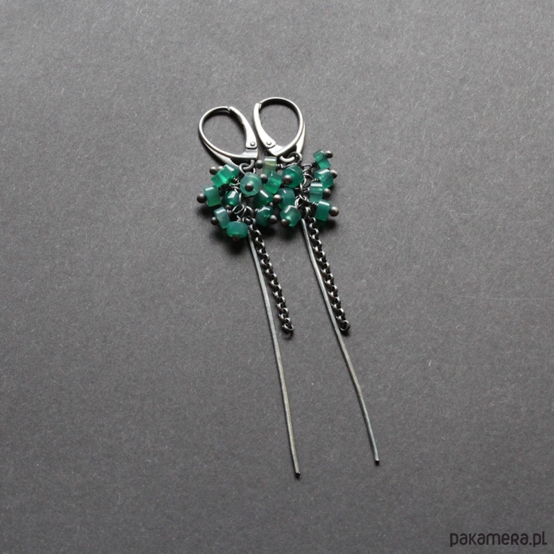 Kolczyki wykonane zostały z mocno oksydowanego srebra próby 925 oraz plasterków zielonego onyksu wielkości 0,3 cm.