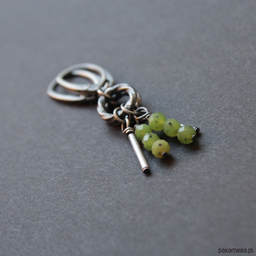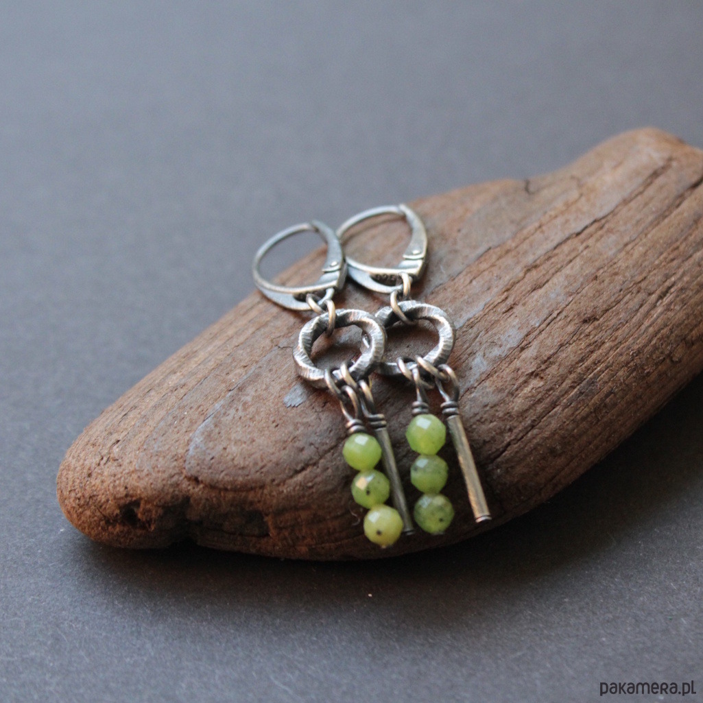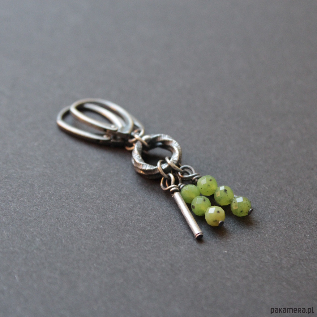 Kolczyki wykonane zostały z oksydowanego srebra próby 925 oraz fasetowanych kuleczek nefrytów wielkości 0,4 cm.