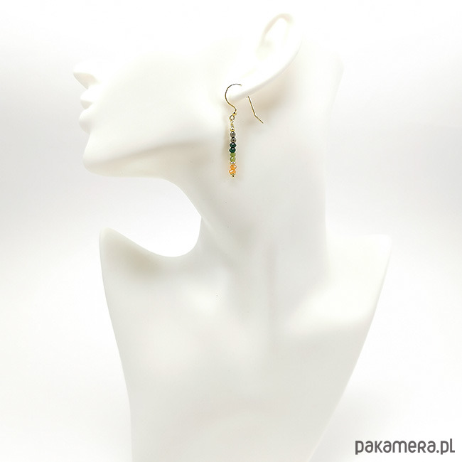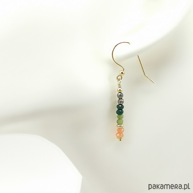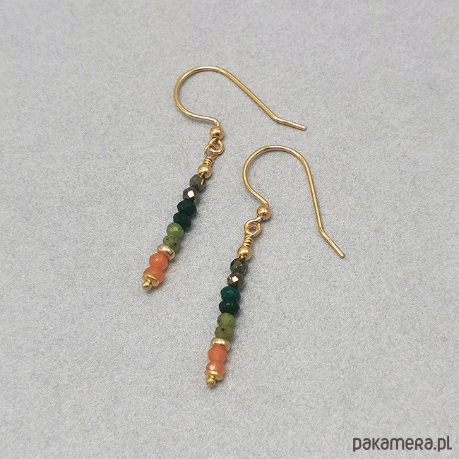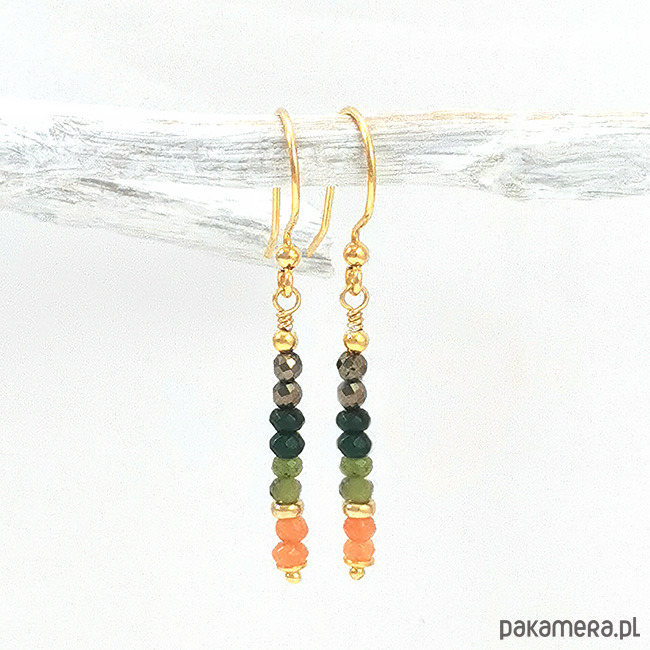 Delikatne kolczyki z jadeitami i pirytem. Kamienie w rozmiarze od 2 do 3mm. Wykonane ze srebra próby 925 pozłacanego 24-karatowym złotem. Długość całkowita z biglami: 4,6cm. Opakowane w firmowe pudełeczko.