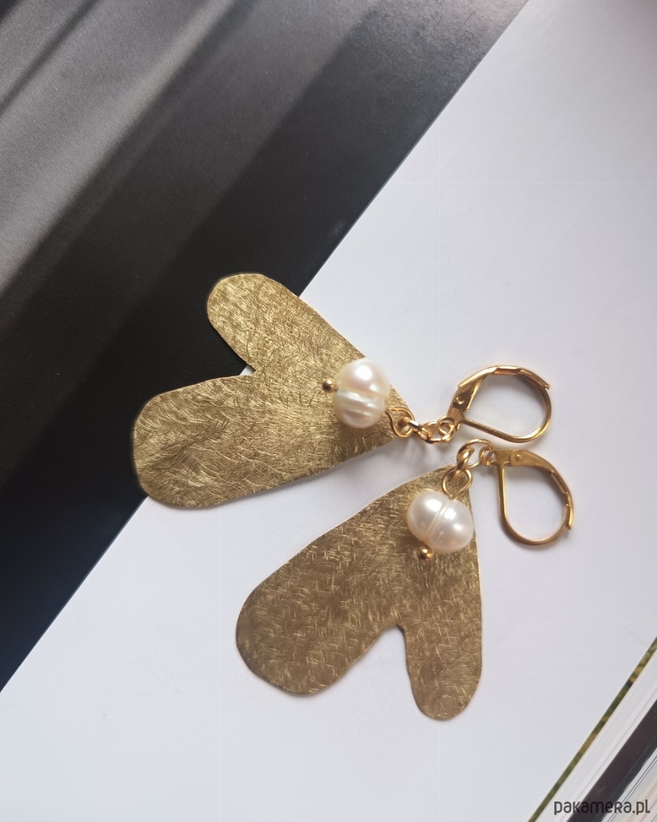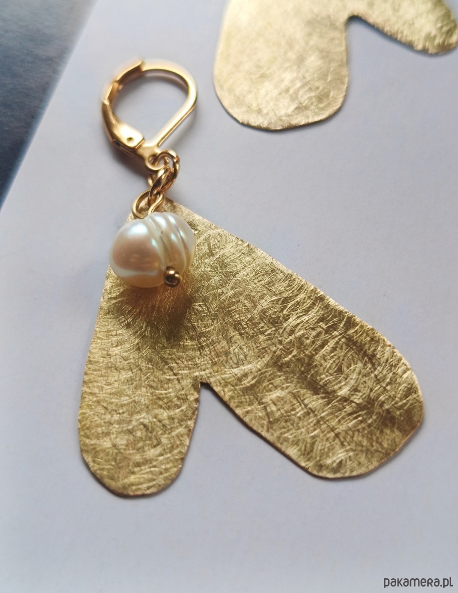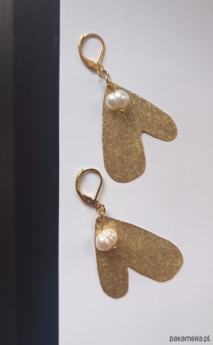 Kolczyki z perłami słodkowodnymi z wyciętą ręcznie jemiołą z miedzi i biglami ze stali chirurgicznej.