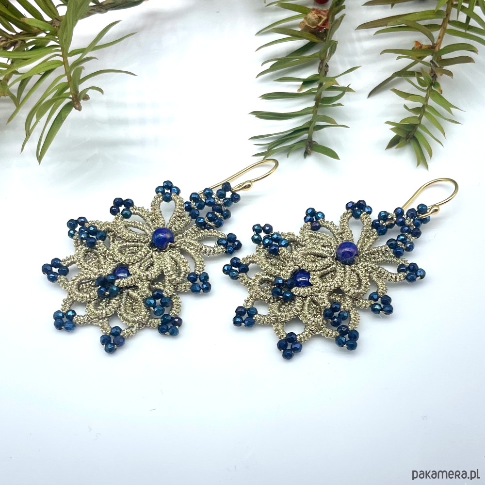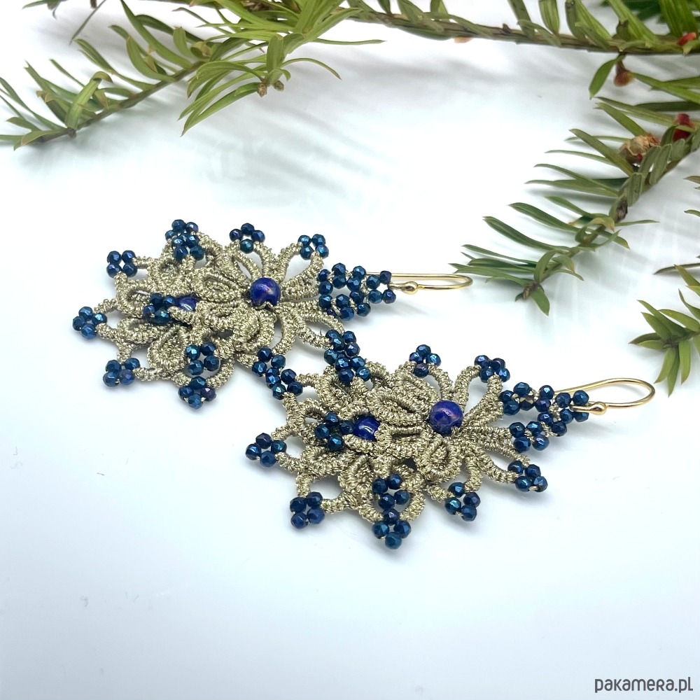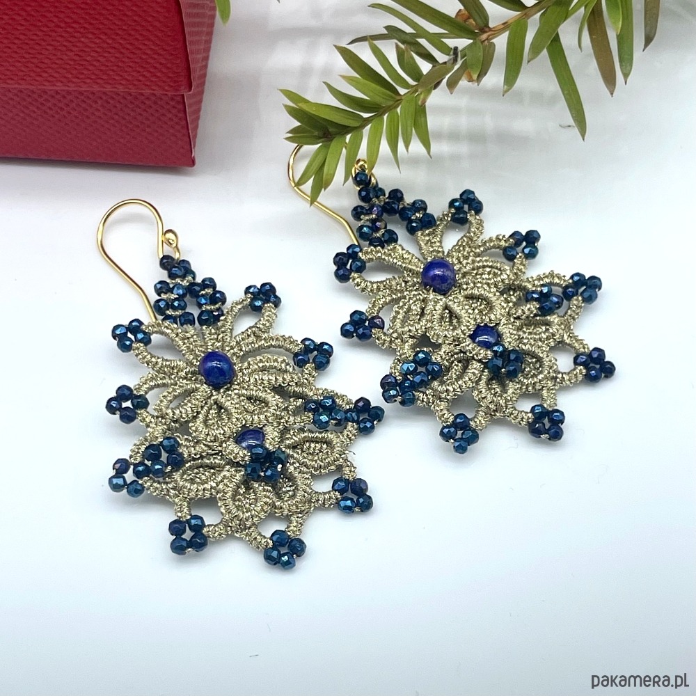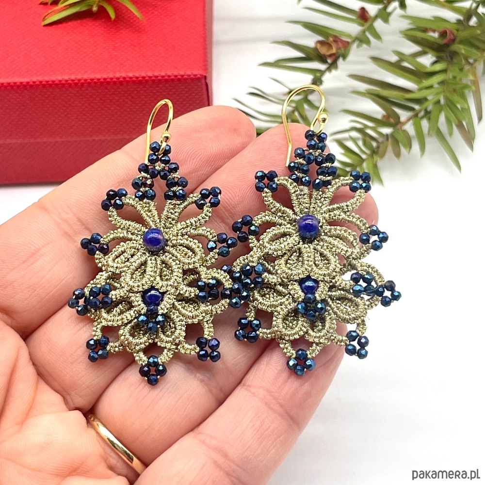 Duże, koronkowe kolczyki wykonane ręcznie w technice frywolitki z nici metalizowanej w kolorze złotym. Ozdobione drobnymi, szklanymi koralikami, które podkreślają ich blask. Niezwykle kobiece, bardzo lekkie. Zostały zabezpieczone preparatem, który chroni je przed zabrudzeniem i zapobiega odkształcaniu się. Polecam do wieczorowych lub świątecznych stylizacji.