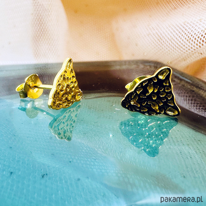 Nowoczesne kolczyki sztyfty z motywem głowy lamparta, zaprojektowane w geometrycznym, stylizowanym wydaniu. Wykonane ze srebra 925 i pozłacane 24 k złotem, z precyzyjnymi detalami, które podkreślają wyrazisty design.