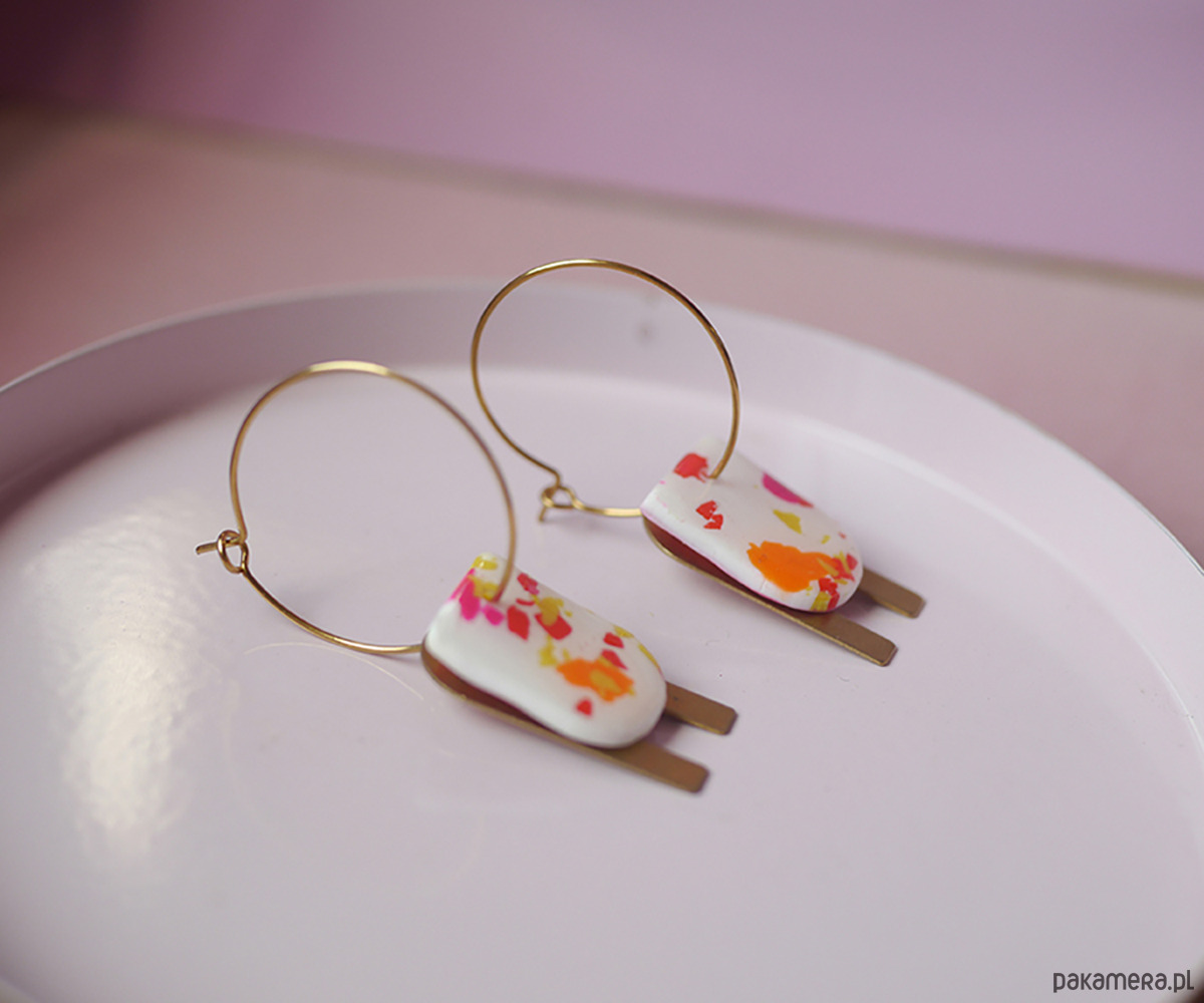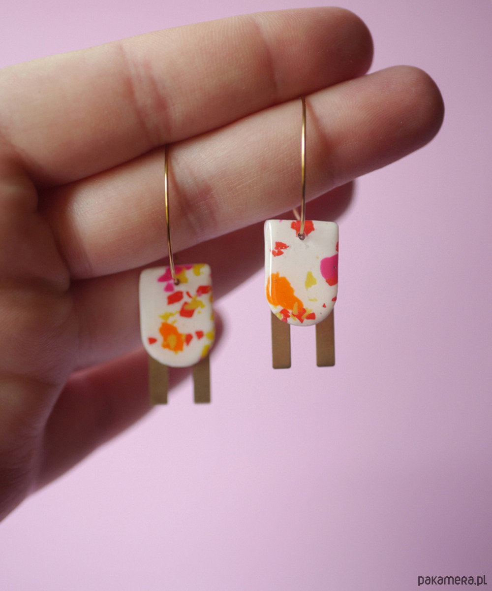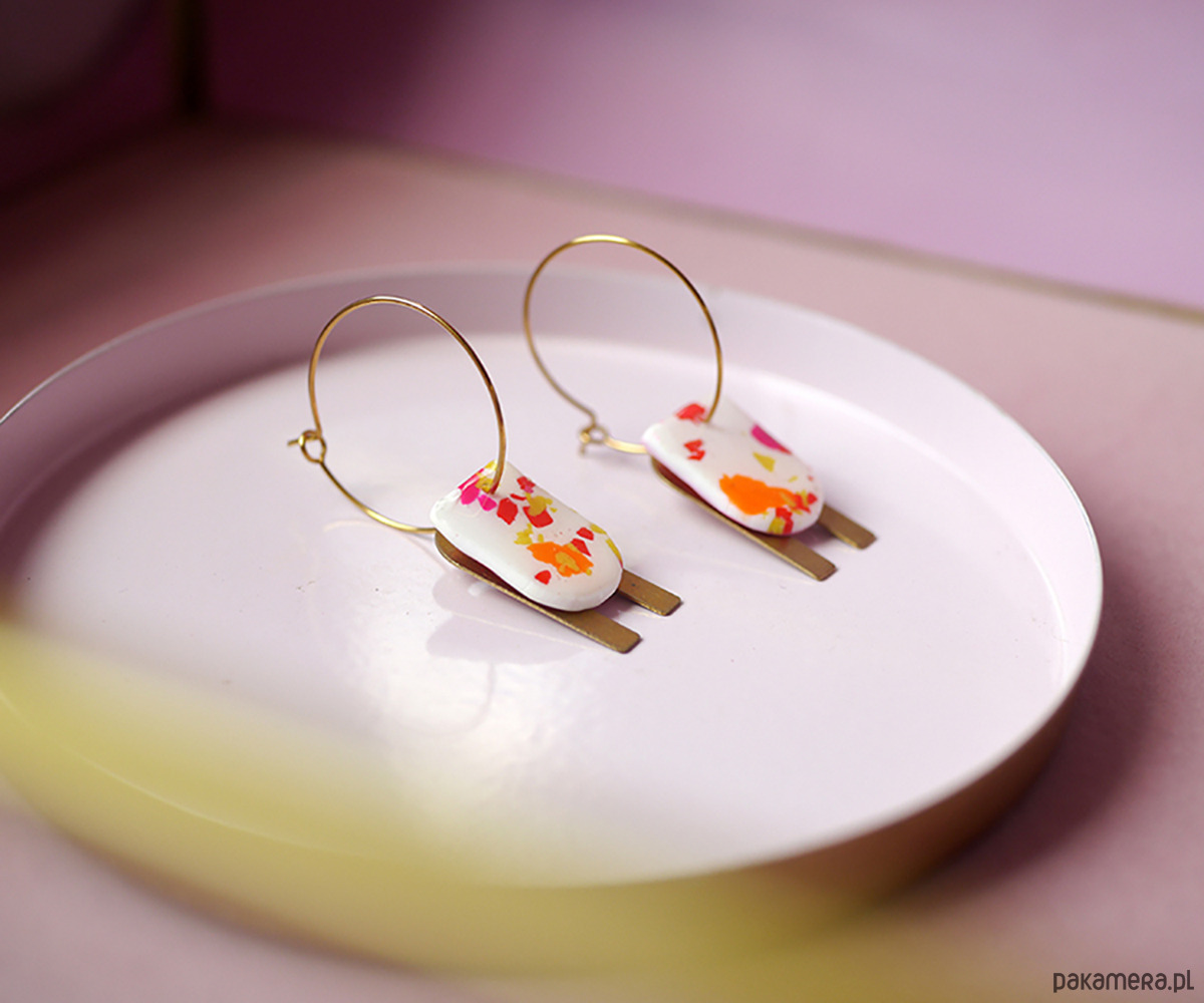 Oryginalne kolczyki w letnich kolorach- fuksji, czerwieni, połączonej z bielą i złotem.