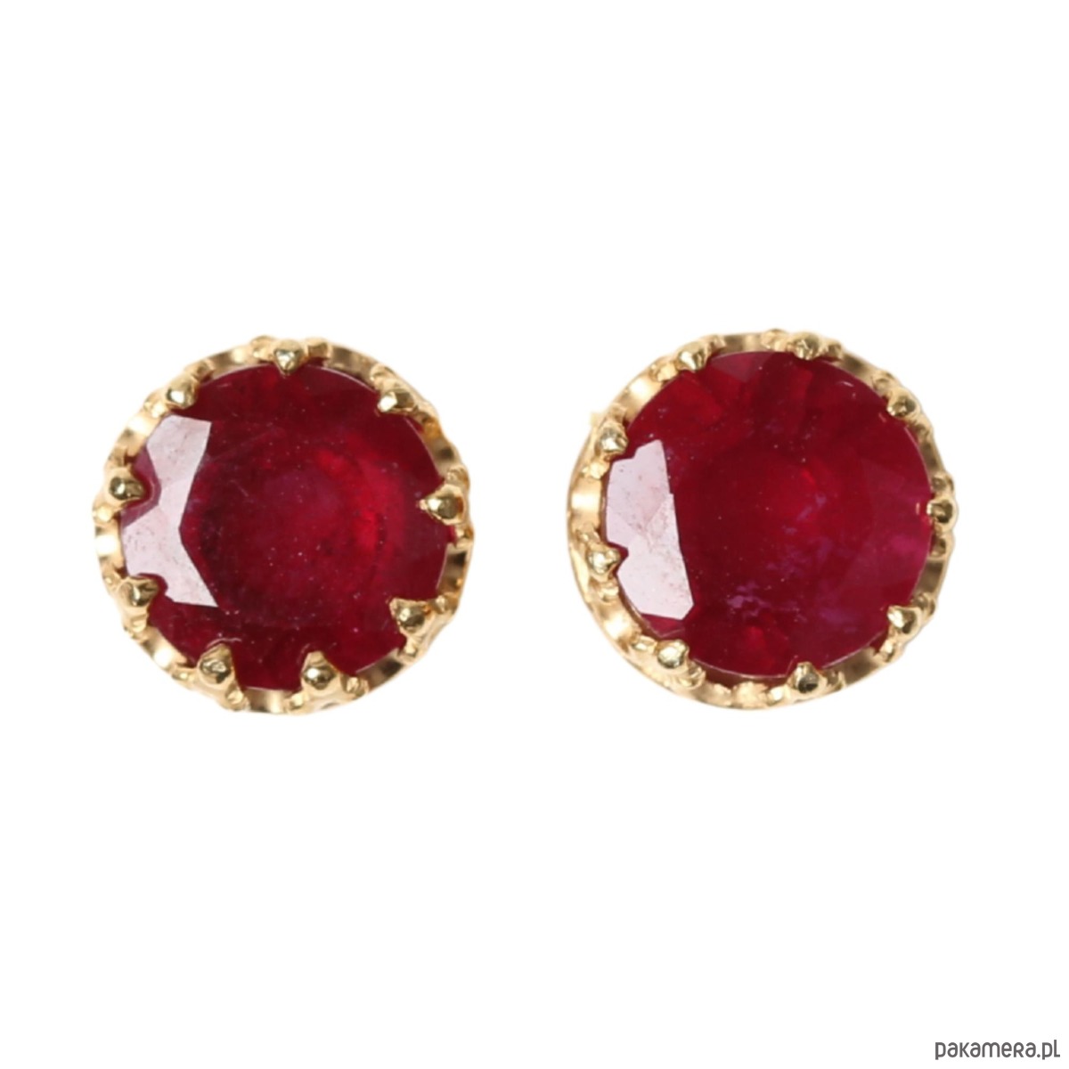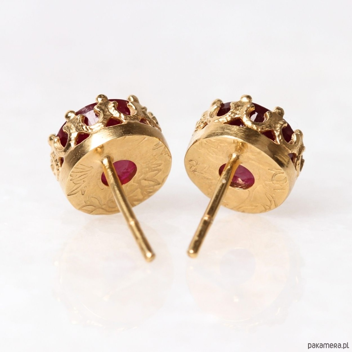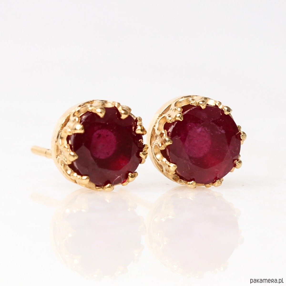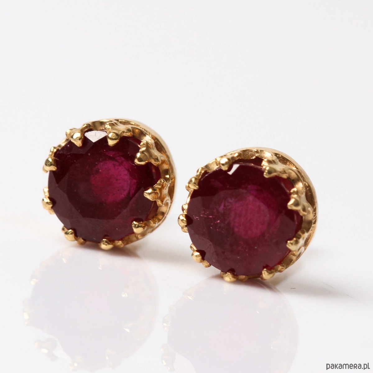 Ręcznie wykonane kolczyki ze srebra pokrytego 24 karatowym złotem z fasetowanymi rubinami z pięknym wykończeniem vintage wokół kamieni.