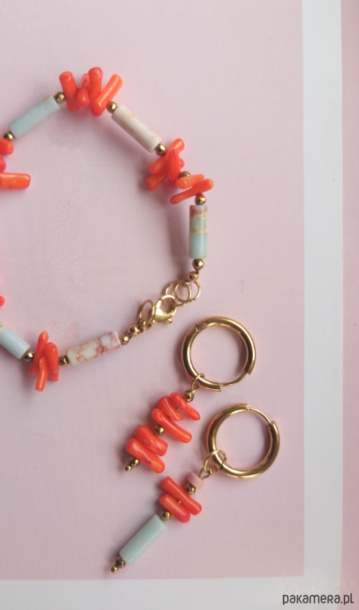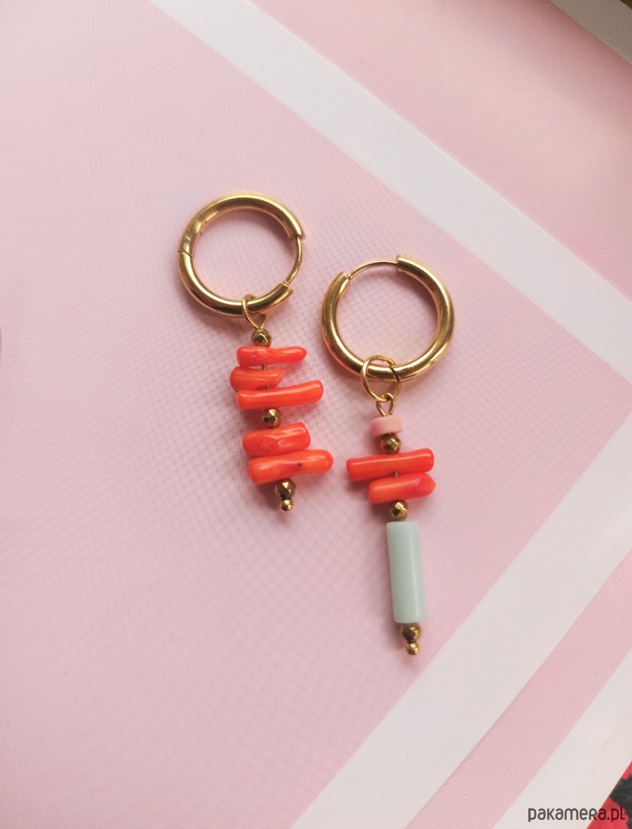 Energetyczne kolczyki,rozświetlające i energetyzujące z korala,howlitu i hematytu.Bigle ze stali chirurgicznej.