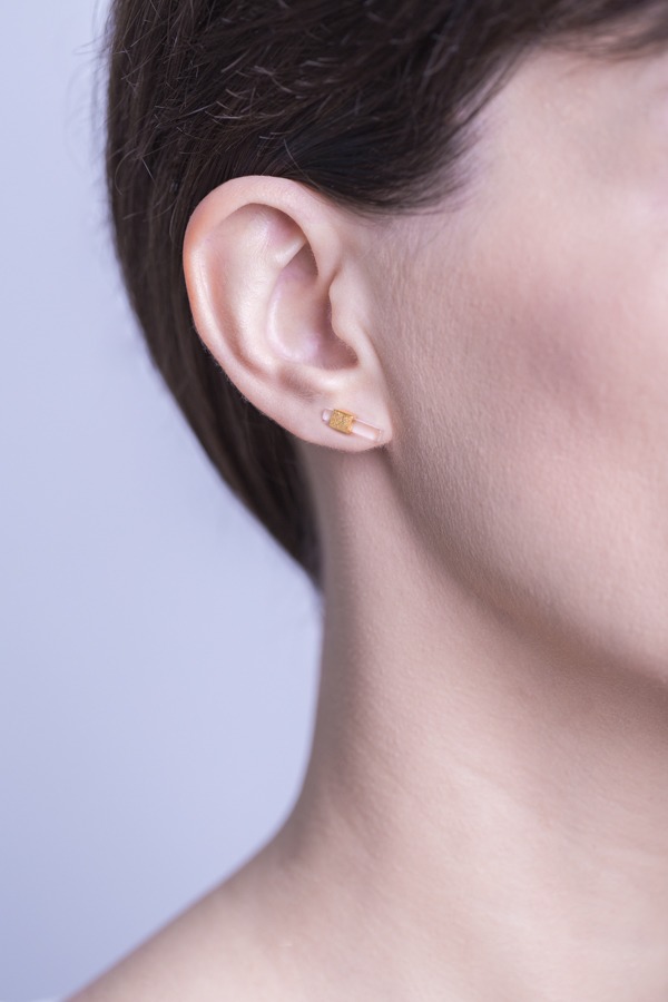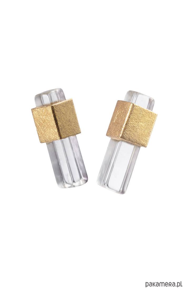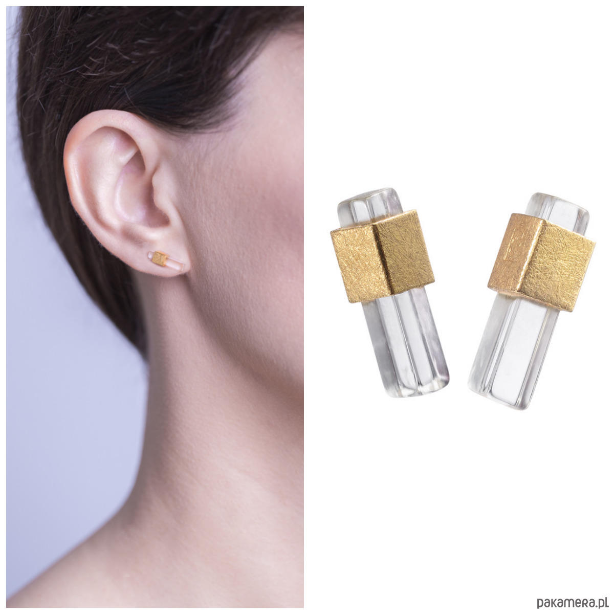 Malutkie, niespełna jedno centymetrowe kolczyki na sztyft. Ciekawe połączenie kryształu i złota. Doskonale prezentują się zarówno w pionie jak i w poziomie. Pozłocone 1 mikronem złota, czyli grubością, która sprawia, iż warstwa jest odporna na ścieranie przez długi czas. Wykonane ręcznie według tradycyjnych technik jubilerskich w małym warszawskim studio.