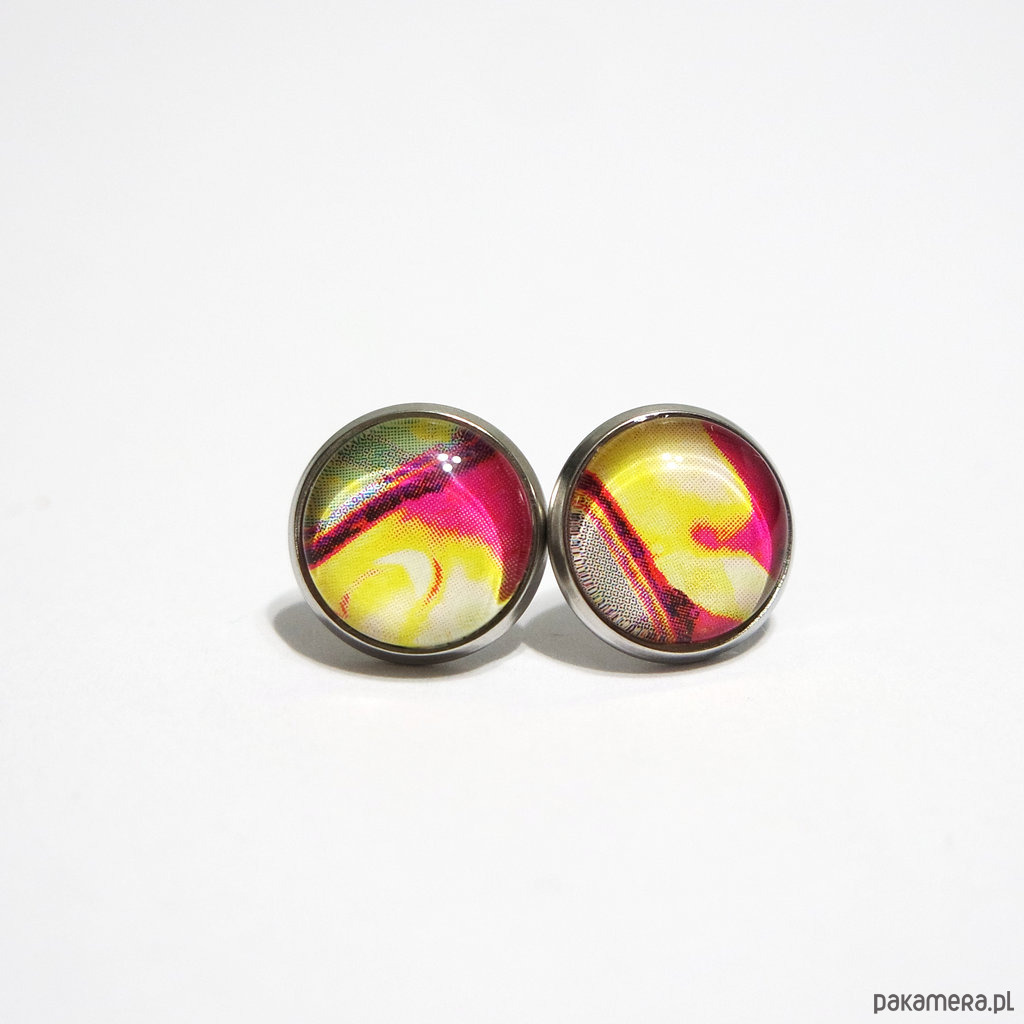 Grafika ukryta w prostych, eterycznych kolczykach, pod osłoną przeźroczystego półokrągłego szkiełka.