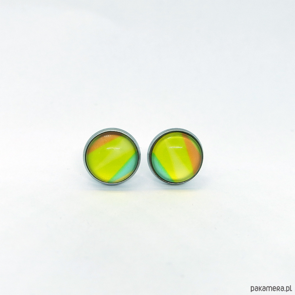 Grafika ukryta w delikatnych, małych kolczykach, pod osłoną przeźroczystego półokrągłego szkiełka.