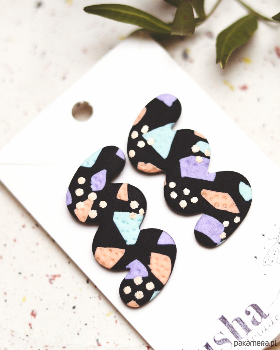 Oryginalne kolczyki ozdobione abstrakcyjnym wzorem, który powstał na 3 różne sposoby - znajdziemy tu kolorowe skrawki glinki, drobne tłoczenia oraz kropeczki wykonane farbą do ceramiki. Całość tworzy ciekawą i niepowtarzalną kompozycję.