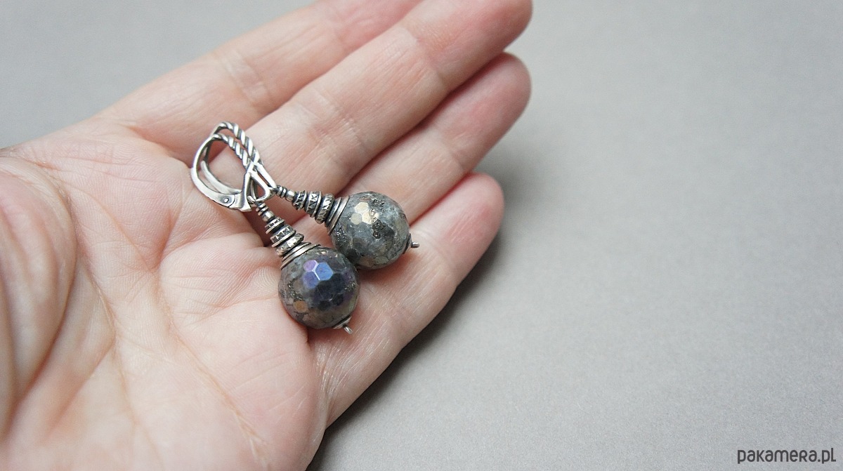 Kolczyki wykonane ze srebra [pr. 925] w połączeniu z fasetowanymi, dużymi kulami labradorytów mystic [14mm]- kamienie posiadają naturalne niedoskonałości [pęknięcia, wżery ]. Całość oksydowana i przetarta. Całkowita długość kolczyków: 4,8cm. Biżuteria ozdobnie zapakowana..