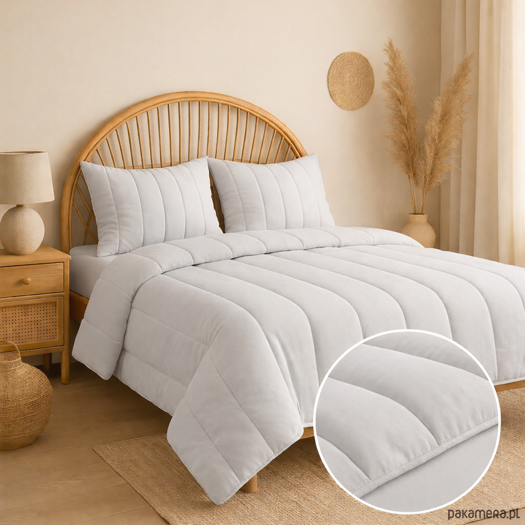 Zewnętrzna warstwa wykonana jest z wysokiej jakości 100% bawełny (alternatywnie: 100% lnu), a wypełnienie stanowią lekkie włókna poliestrowe. Kołdra jest miękka, oddychająca i przyjemna w dotyku. Pikowanie w pasy stabilizuje wypełnienie, zapobiega jego przesuwaniu i pomaga zachować estetyczny wygląd nawet przy częstym praniu.