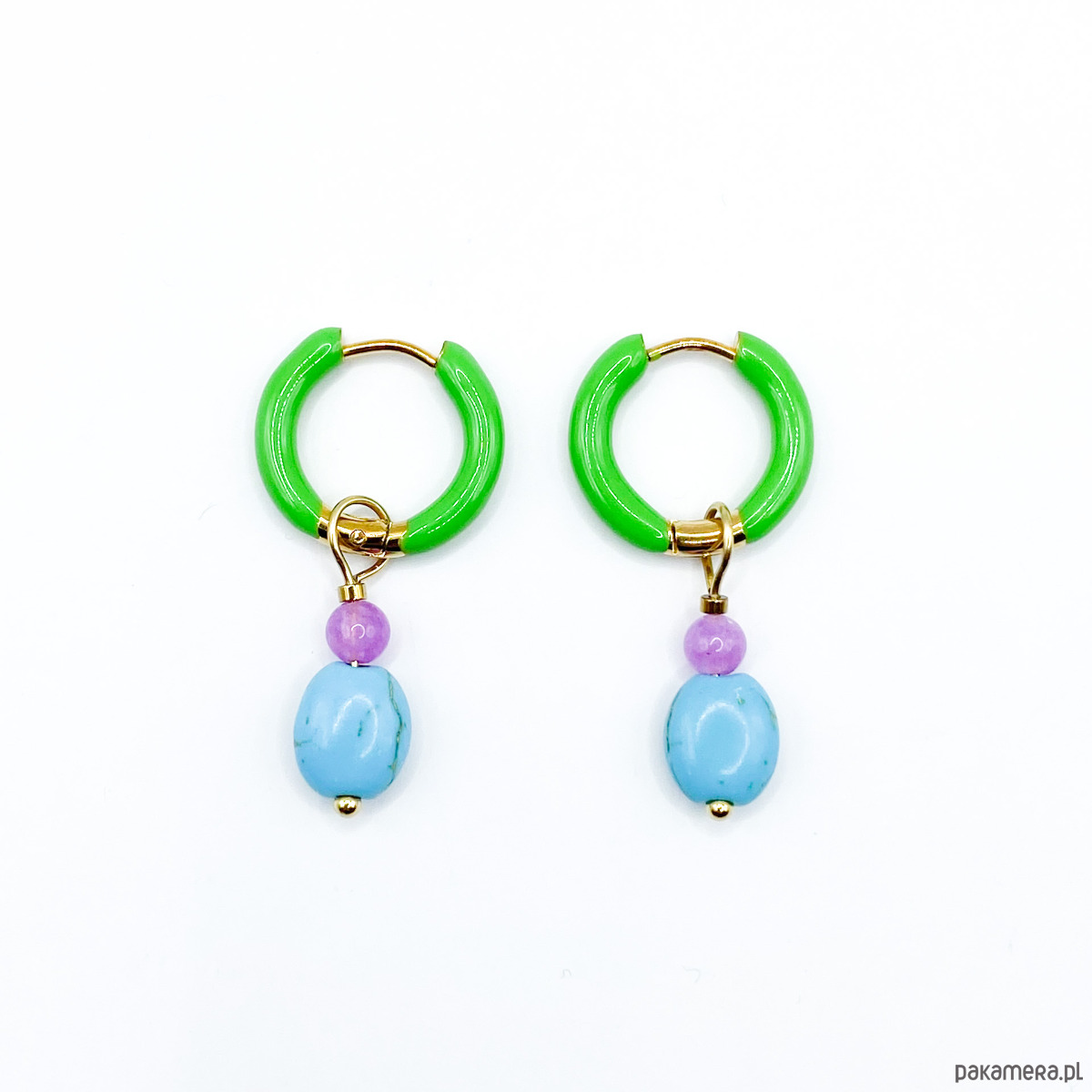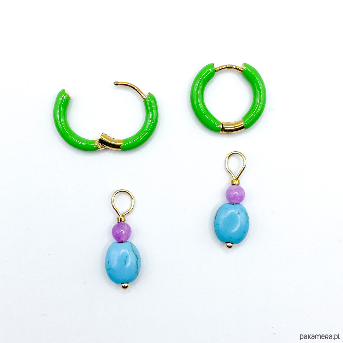 Wykonane ze stali bigle, w kolorze złotym, pokryte częściowo intensywnie zieloną emalią, zamykane na ‘klik’, z zawieszką z minerałów, którą można , w razie potrzeby lub chęci, swobodnie zsuwać z kółka i nosić samą kolorową bazę.
