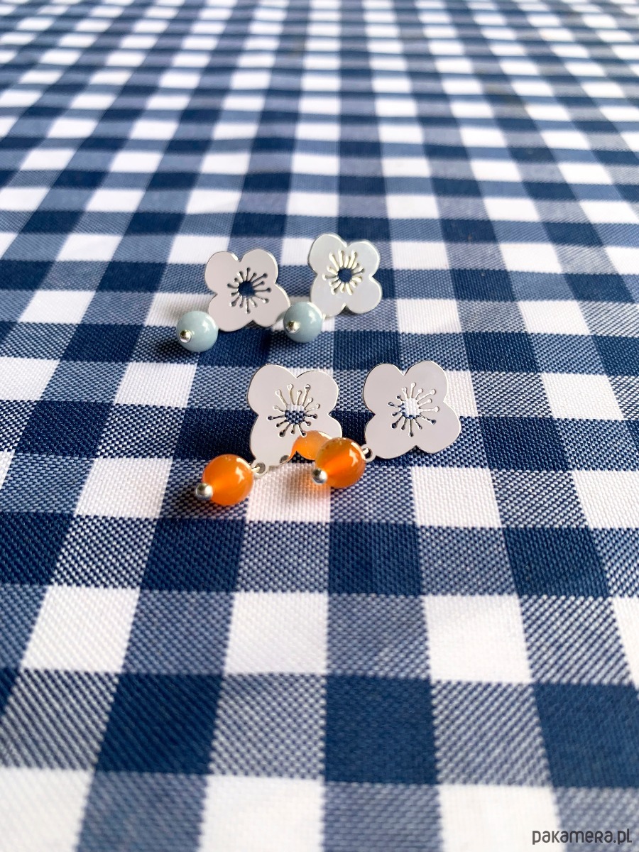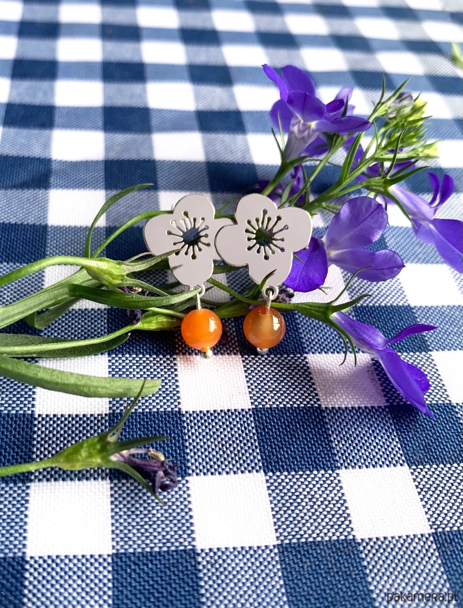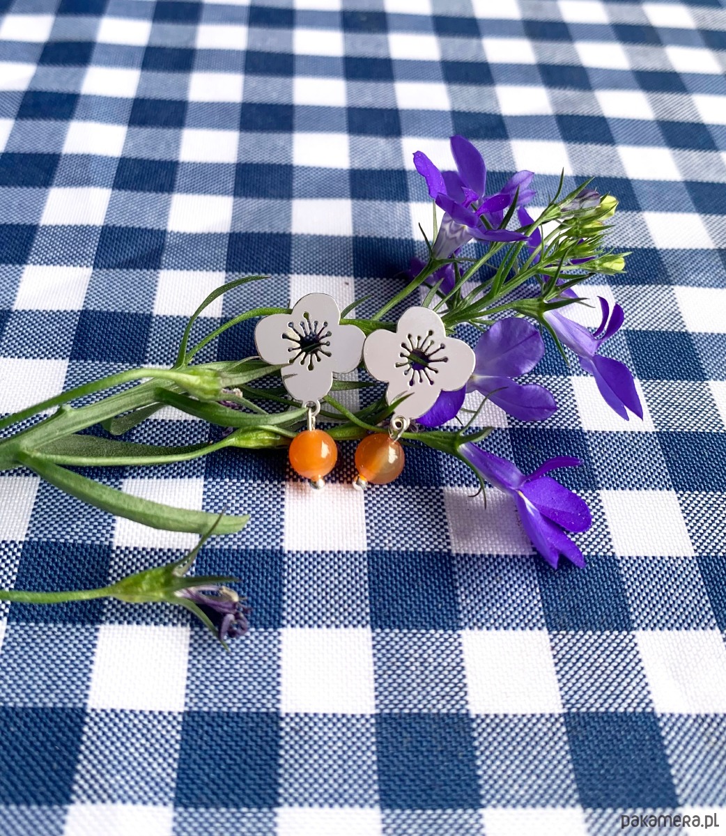 Anemone - Kolczyki/ sztyfty z kwiatuszkiem zawilca inspirowany wzorami z lat 70 z dodatkiem kamieni pomarańczowego karneolu