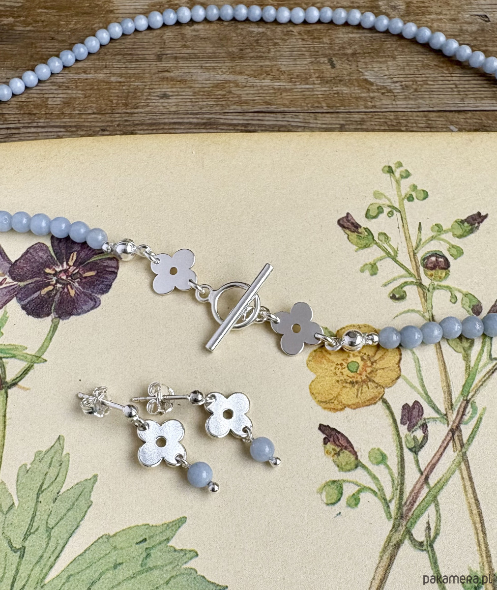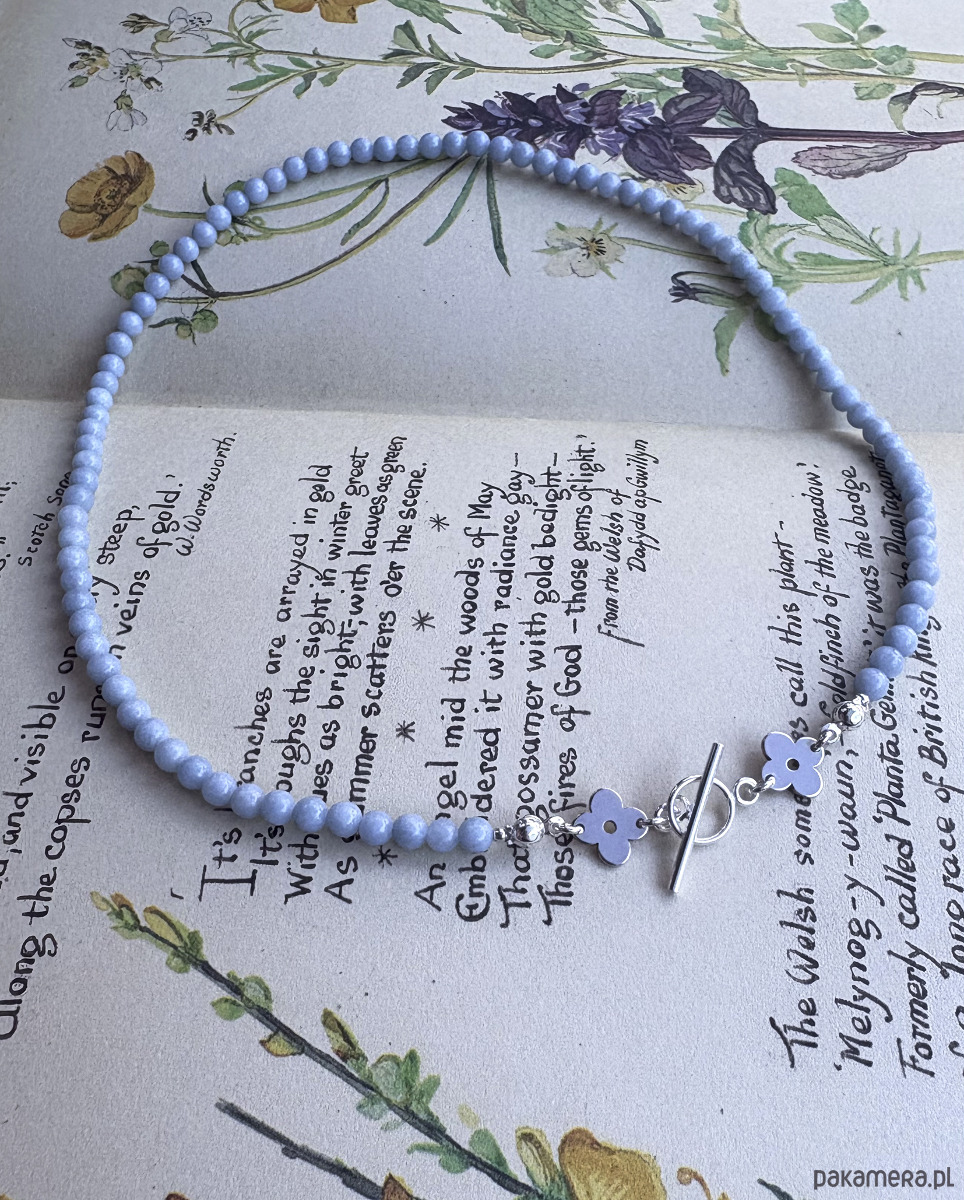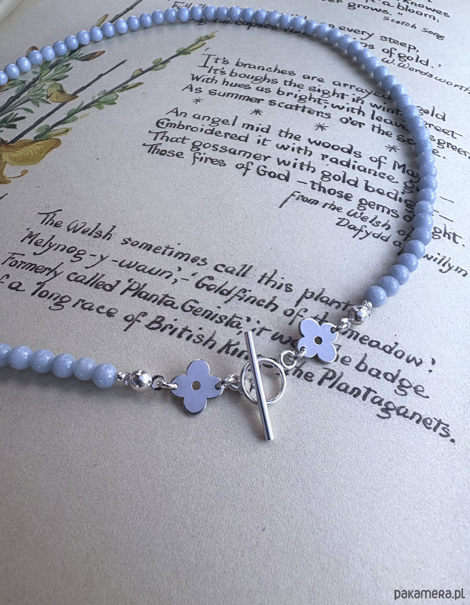 Anemone Sky mini - Przepiękny naszyjnik inspirowany roślinnymi wzorami z lat 70 z dodatkiem naturalnych kamieni błękitnego angelitu.