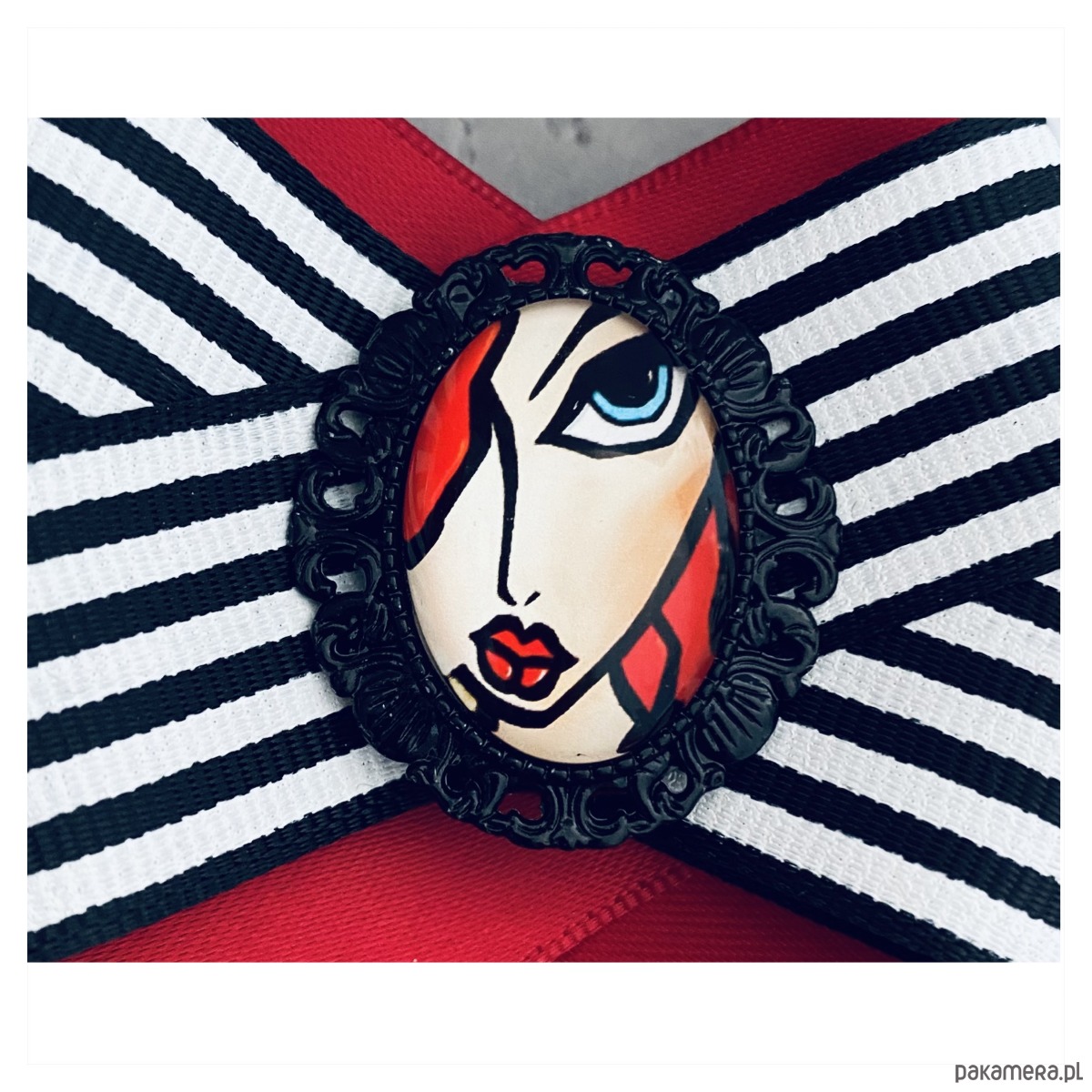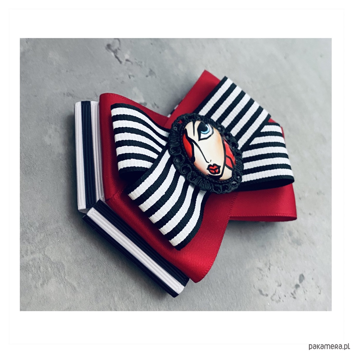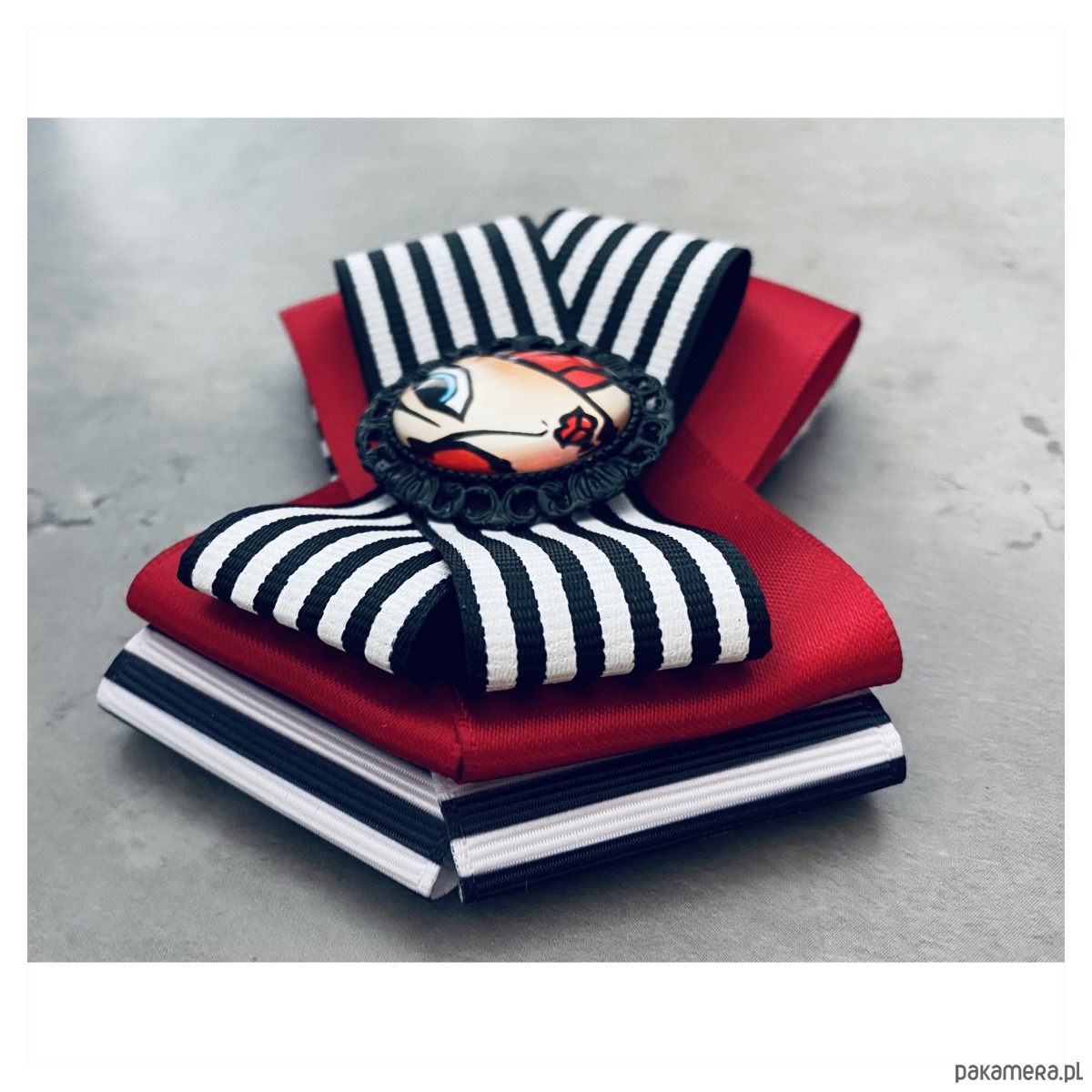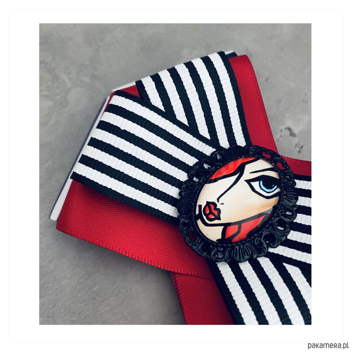 Broszka wykonana z wysokiej jakości taśm i dodatków.