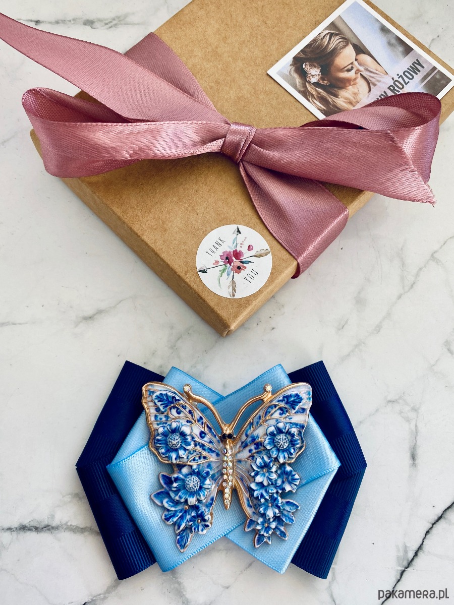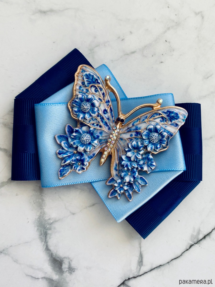 Broszka wykonana z wysokiej jakości taśm i dodatków.