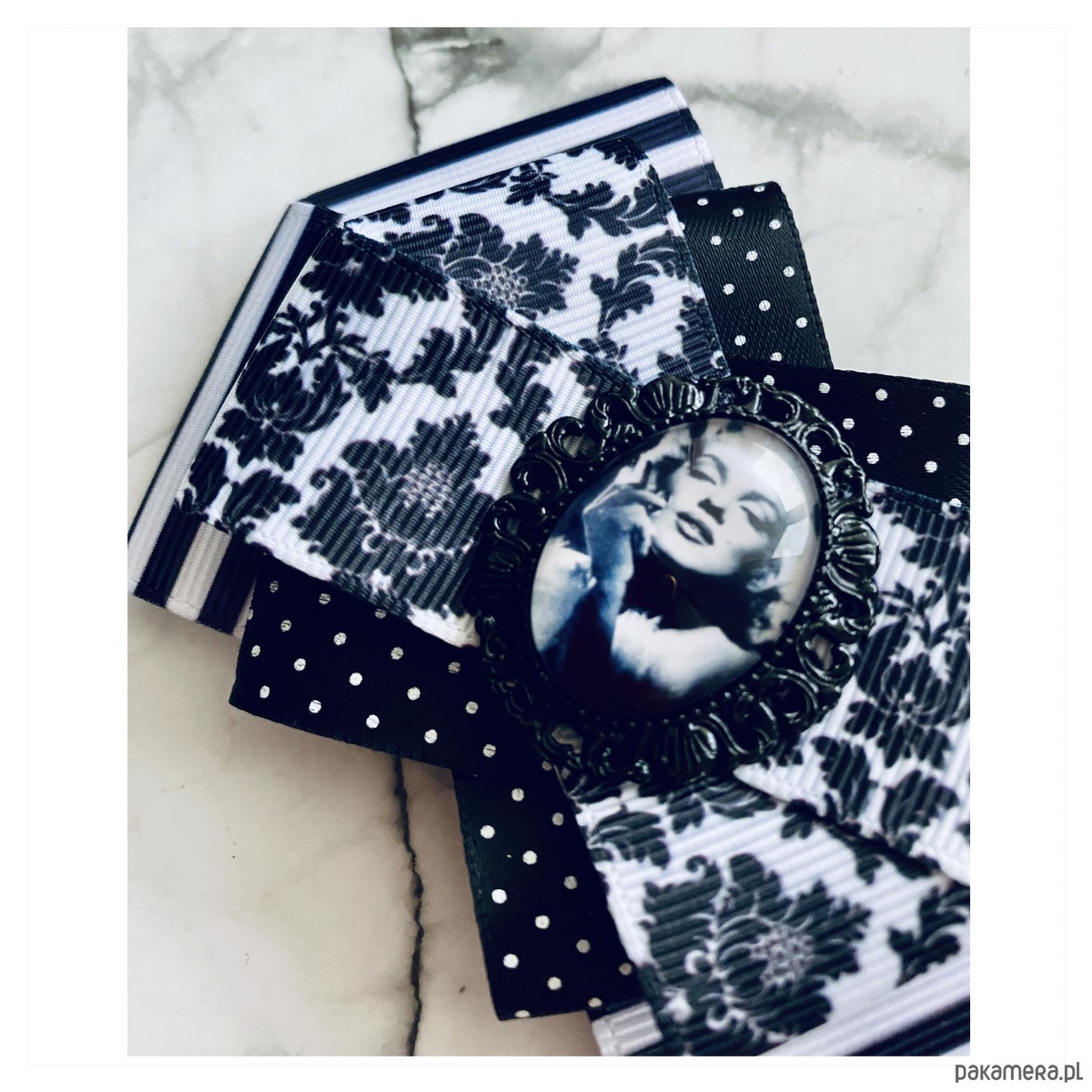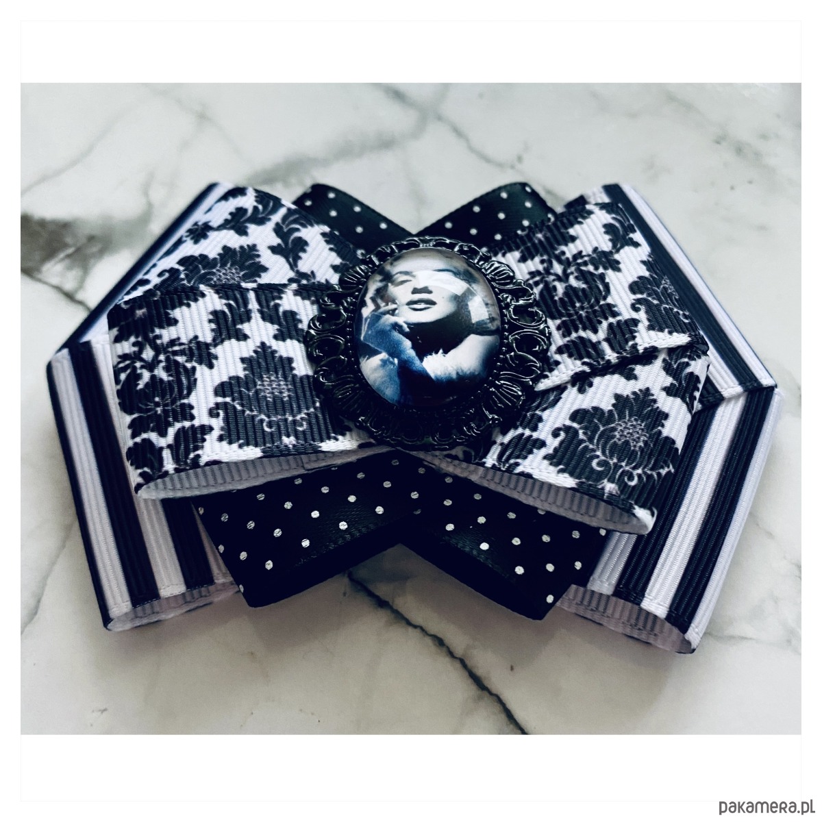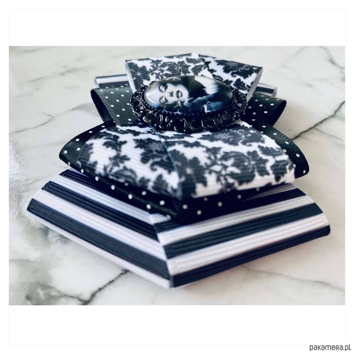 Broszka w kolorach czerni i bieli.