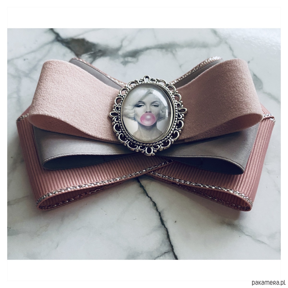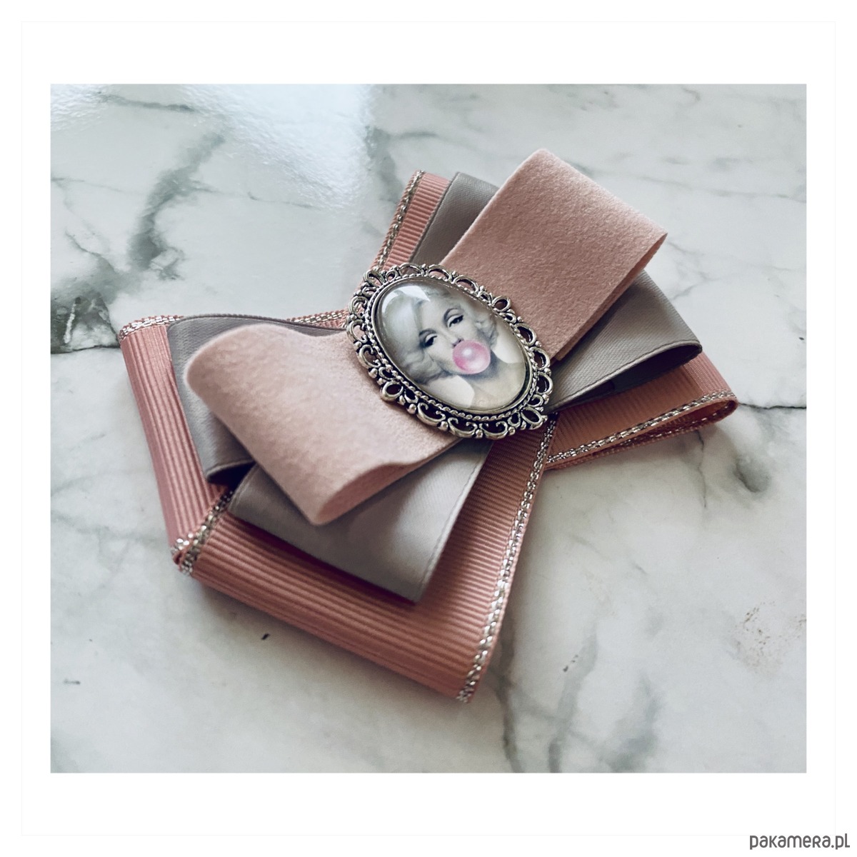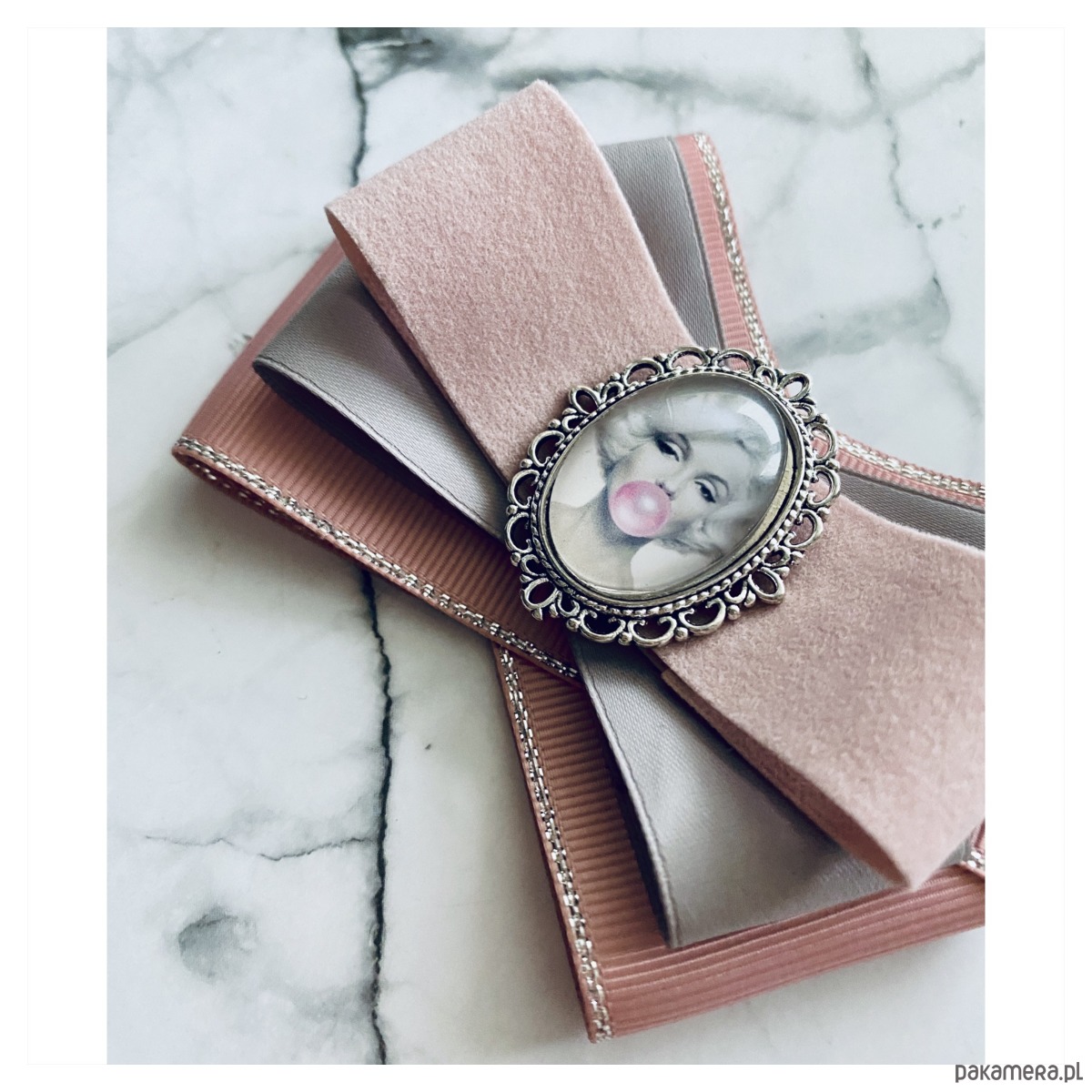 Broszka w kolorach pudrowego różu i szarości.