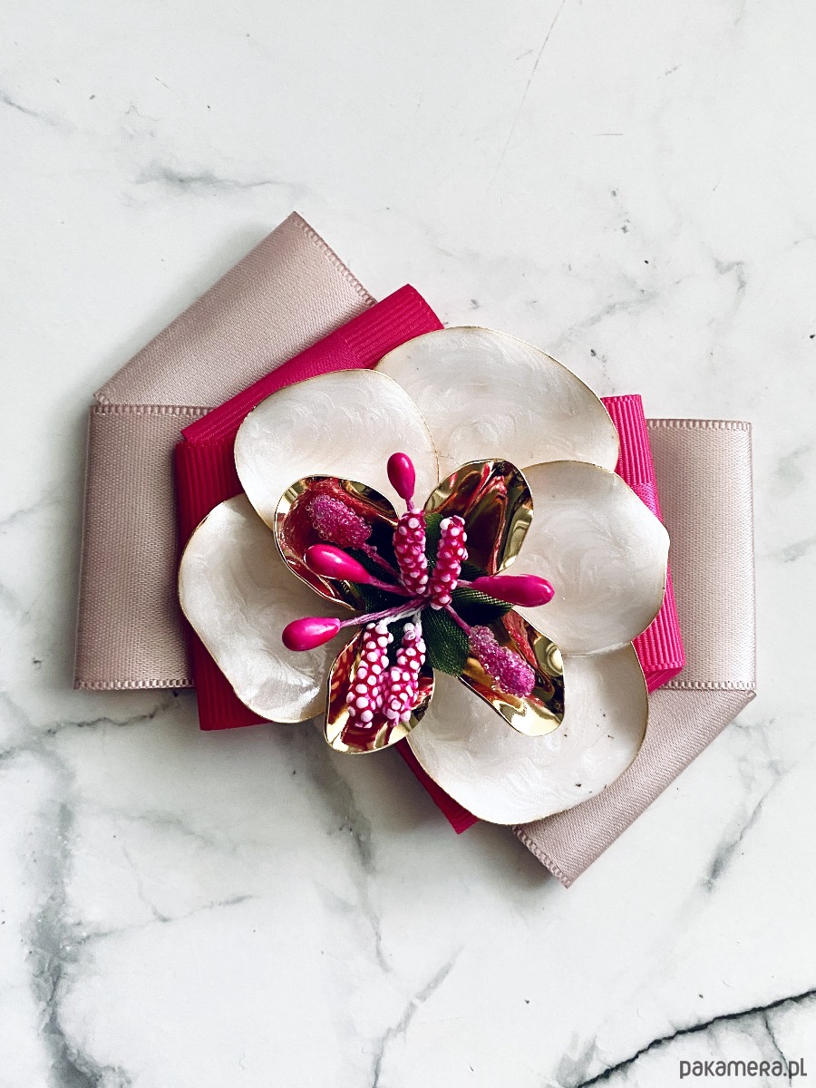Na środku imponujący kwiat z płatkami imitującymi masę perłową z dodatkiem złota i fuksjowych dodatków.