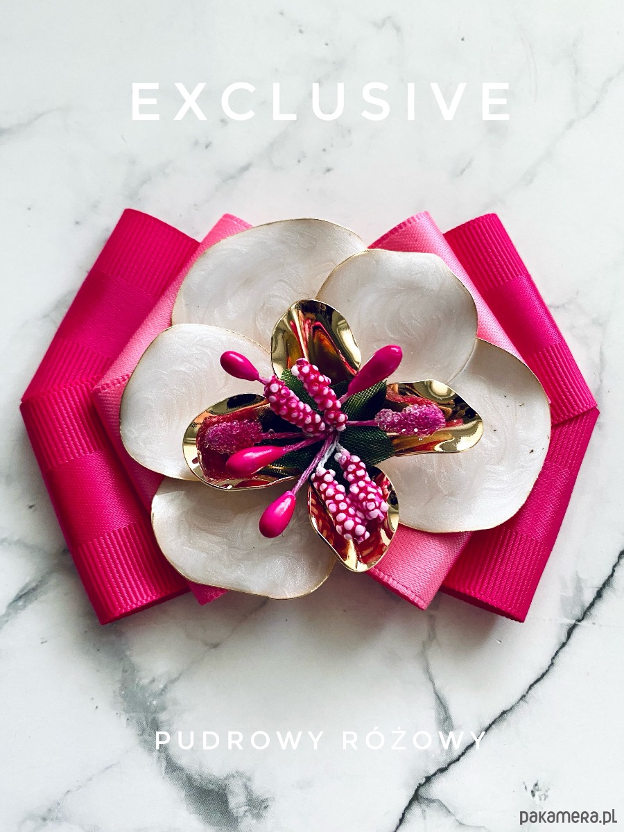 Na środku imponujący kwiat z płatkami imitującymi masę perłową z dodatkiem złota i fuksjowych dodatków.