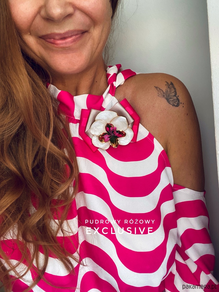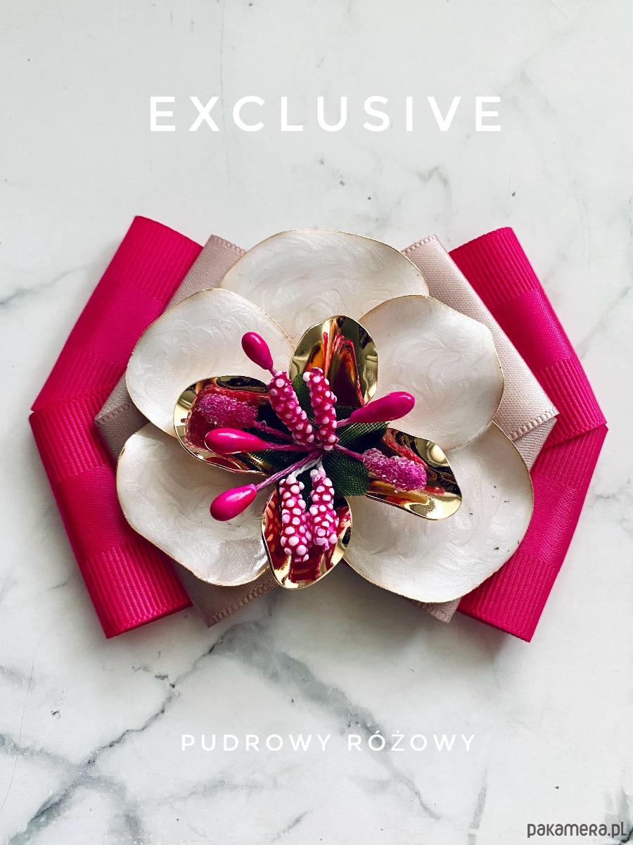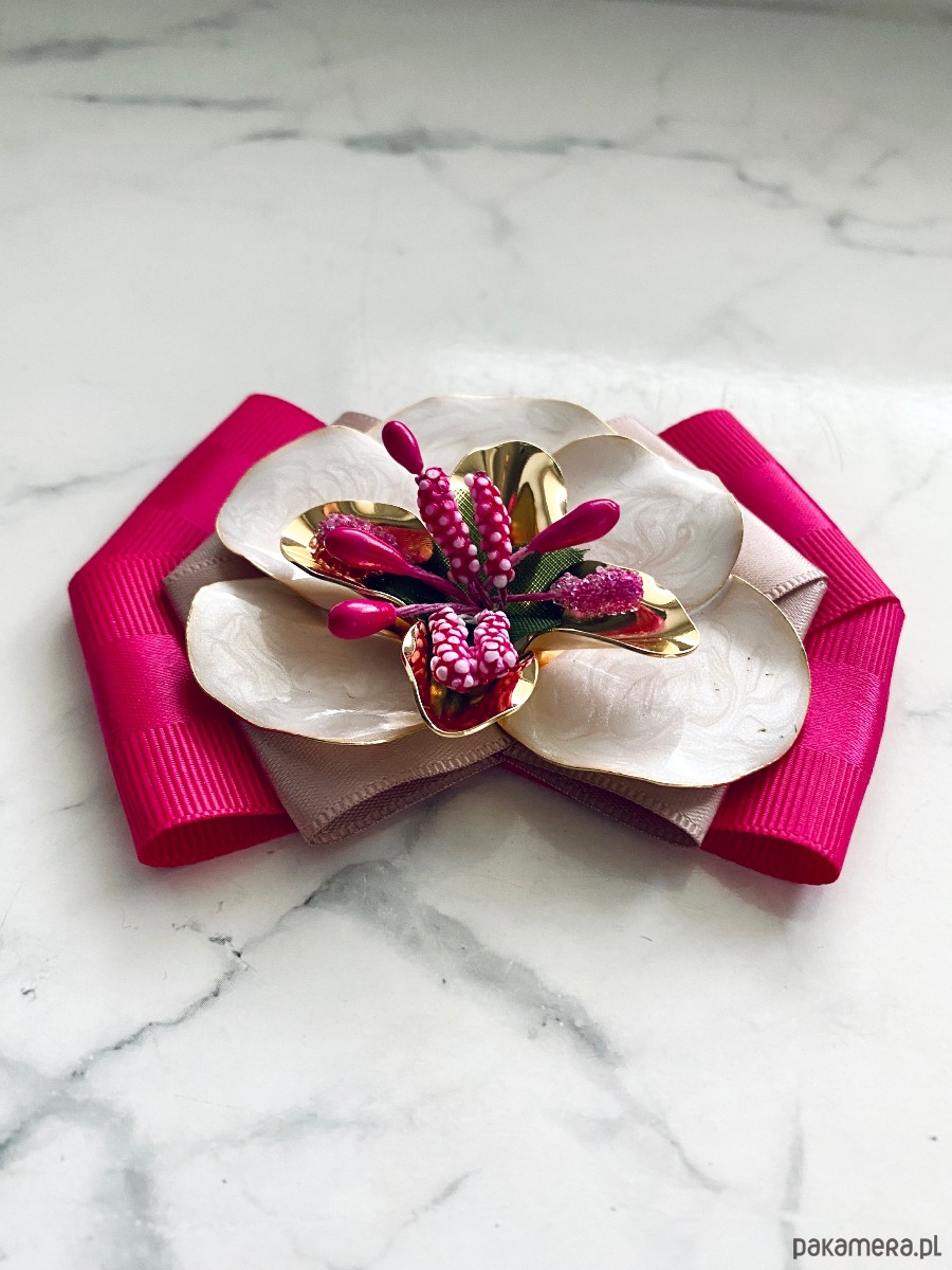 Na środku imponujący kwiat z płatkami imitującymi masę perłową z dodatkiem złota i fuksjowych dodatków.