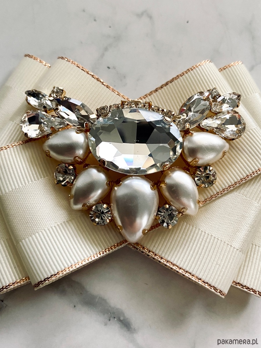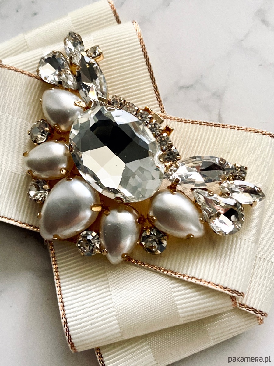 Na środku imponująca ozdoba biżuteryjna duże kryształy wraz z pięknymi perłami.