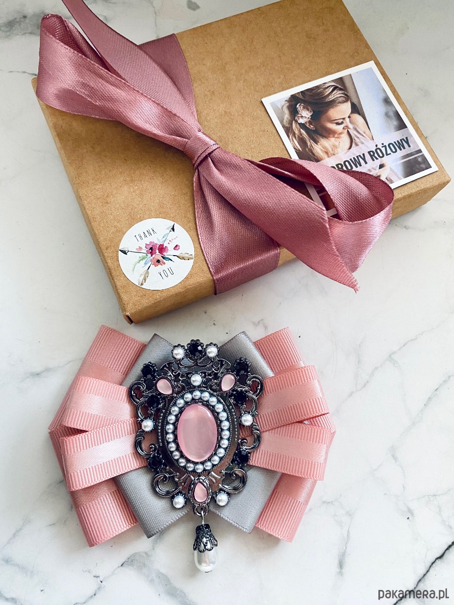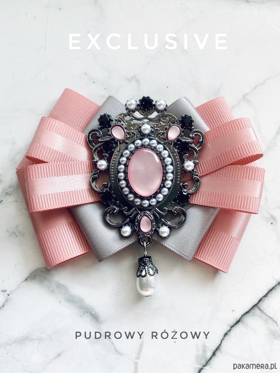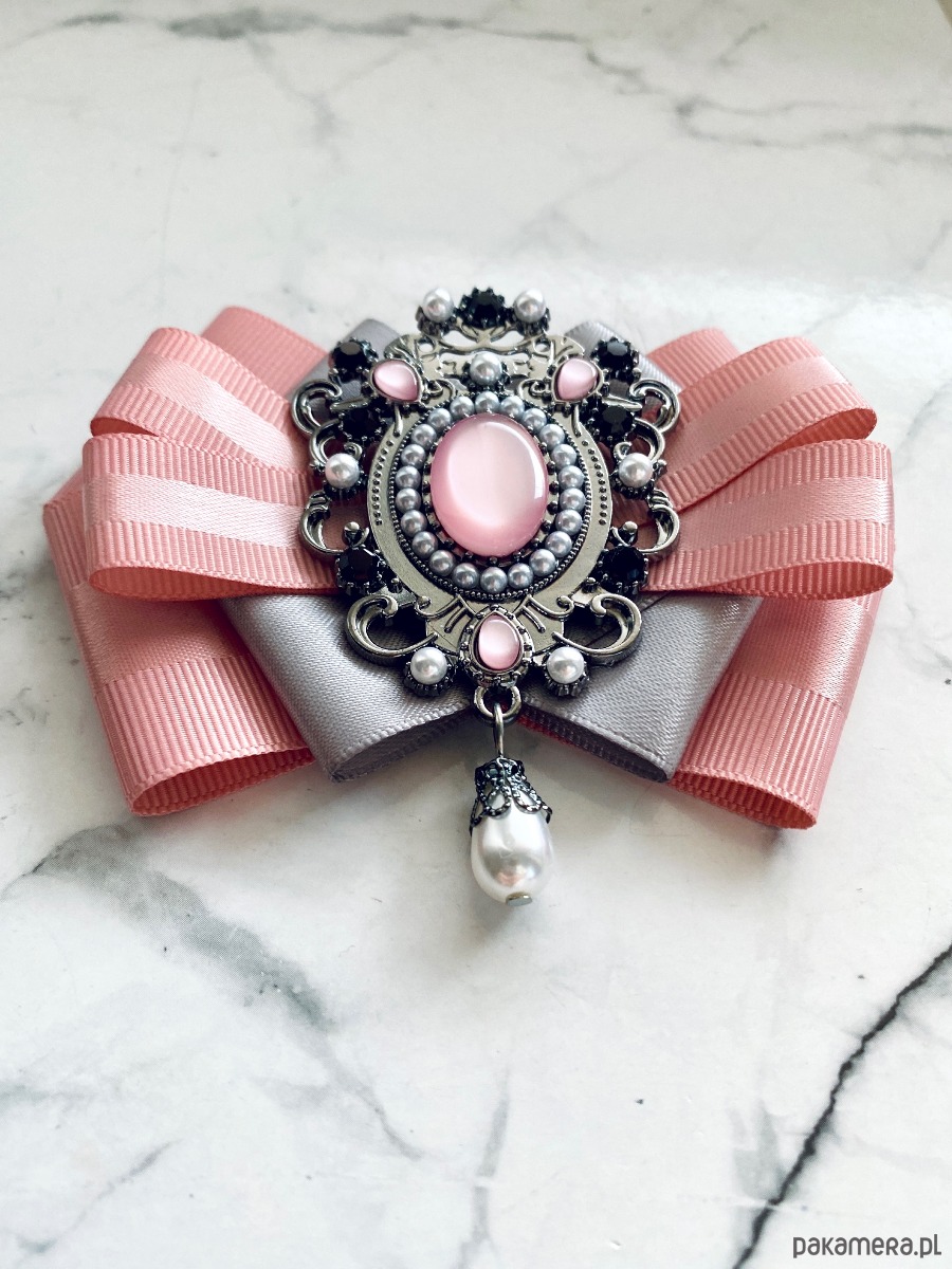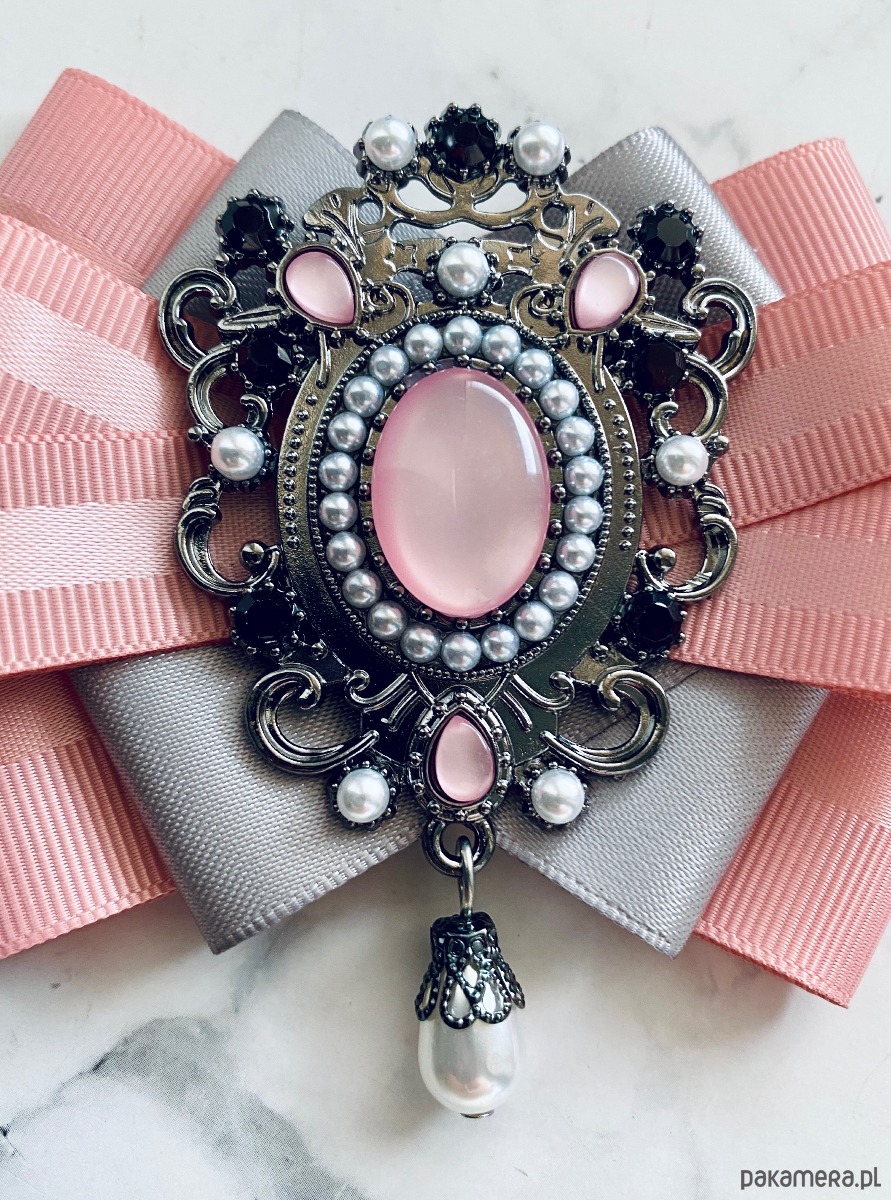 Na środku imponująca ozdoba biżuteryjna, kamień w kolorze pudrowego różu w towarzystwie kryształków, kamieni i perełek.