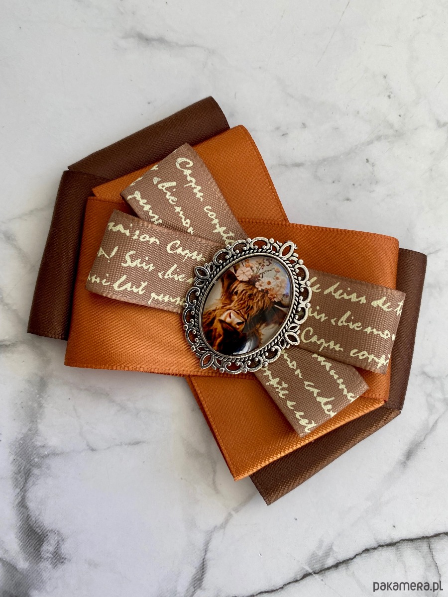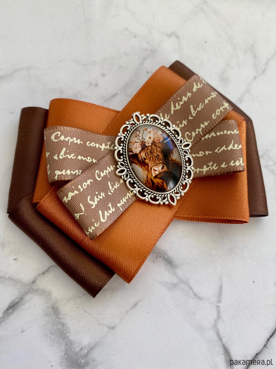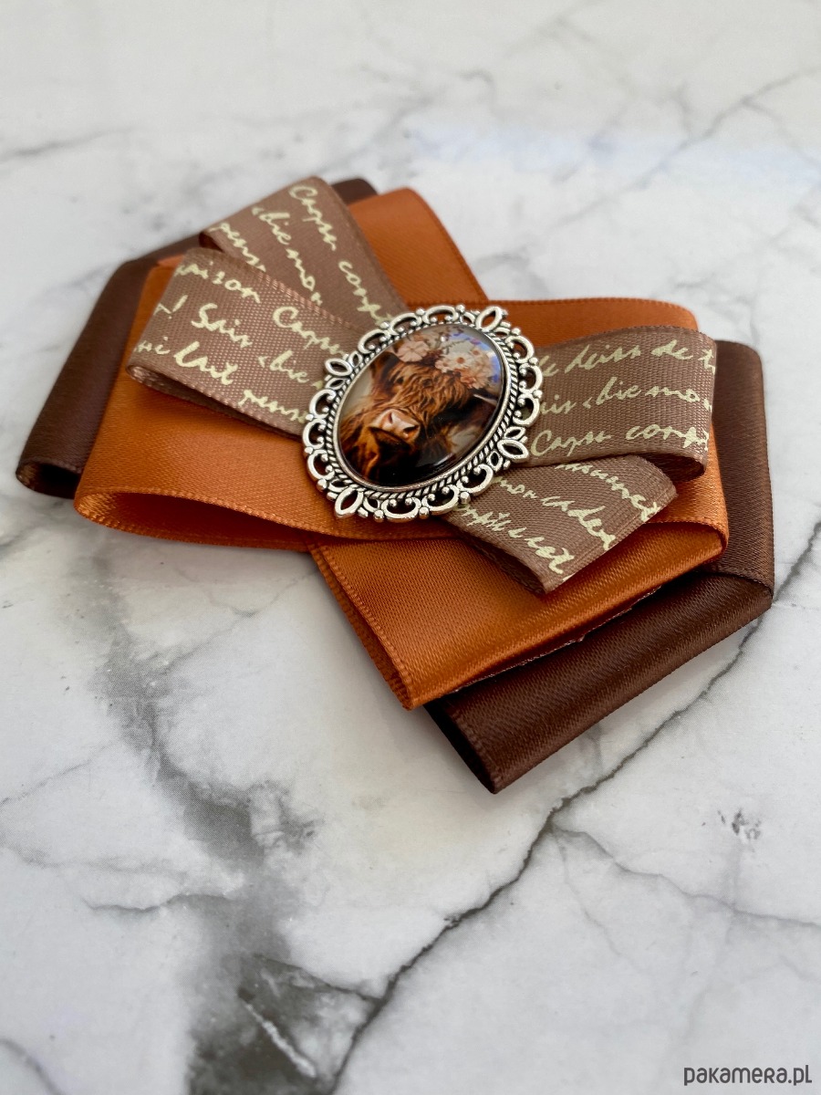 Broszka wykonana z wysokiej jakości taśm i dodatków.