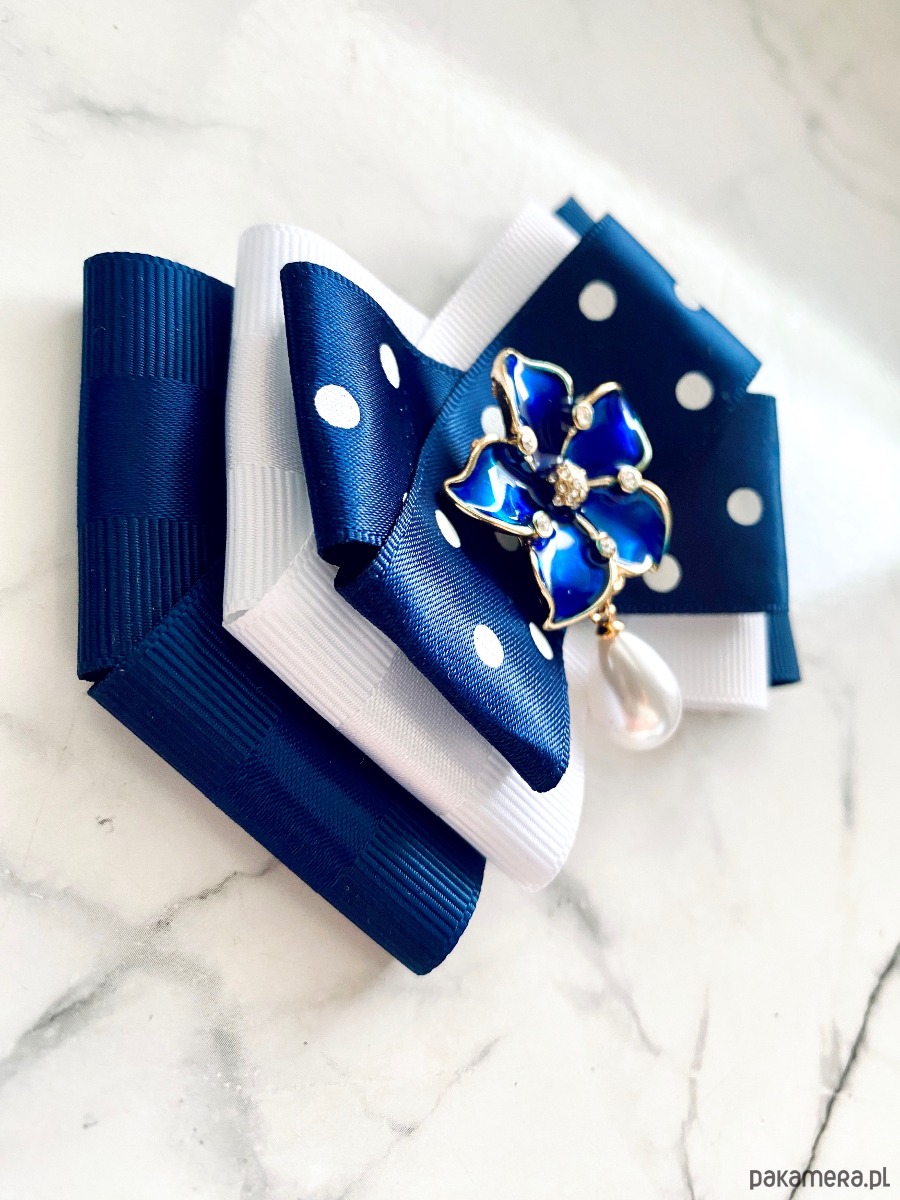 Piękna dekoracyjna ozdoba na środku, granatowy kwiat z delikatnymi cyrkoniami i wiszącą perełką.