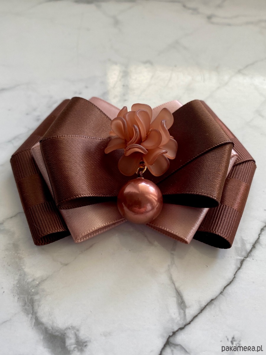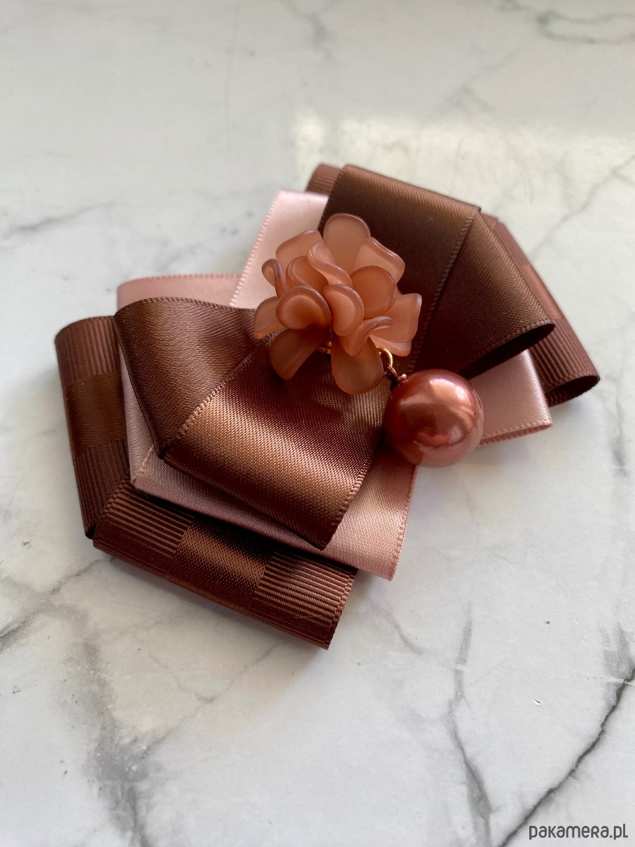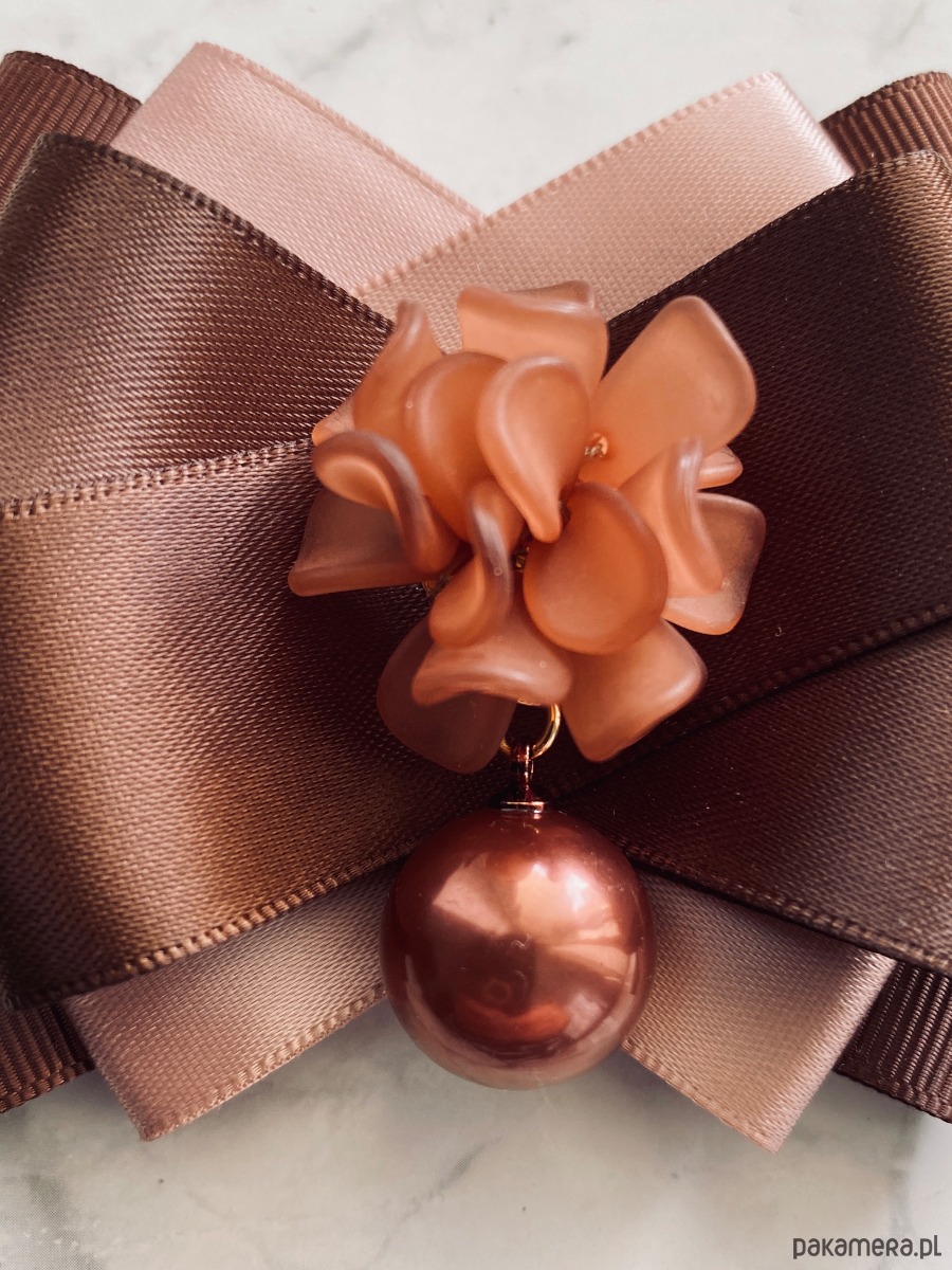 Piękna dekoracyjna ozdoba na środku, kwiaty 3d wykonane z masy a do tego perła, wszystko w cudnym brązowym kolorze.