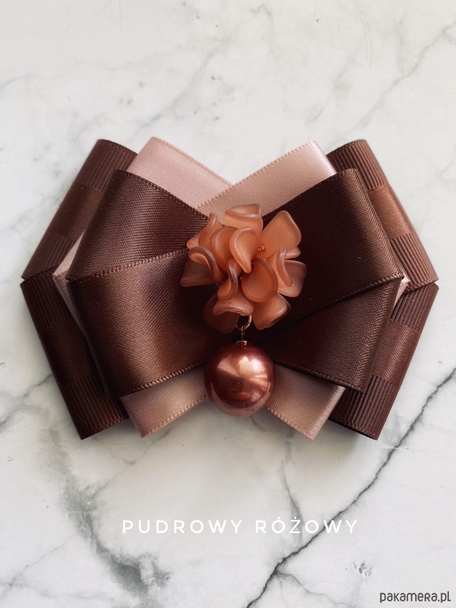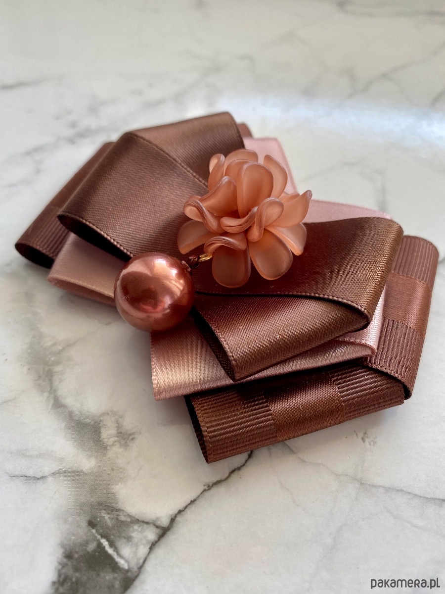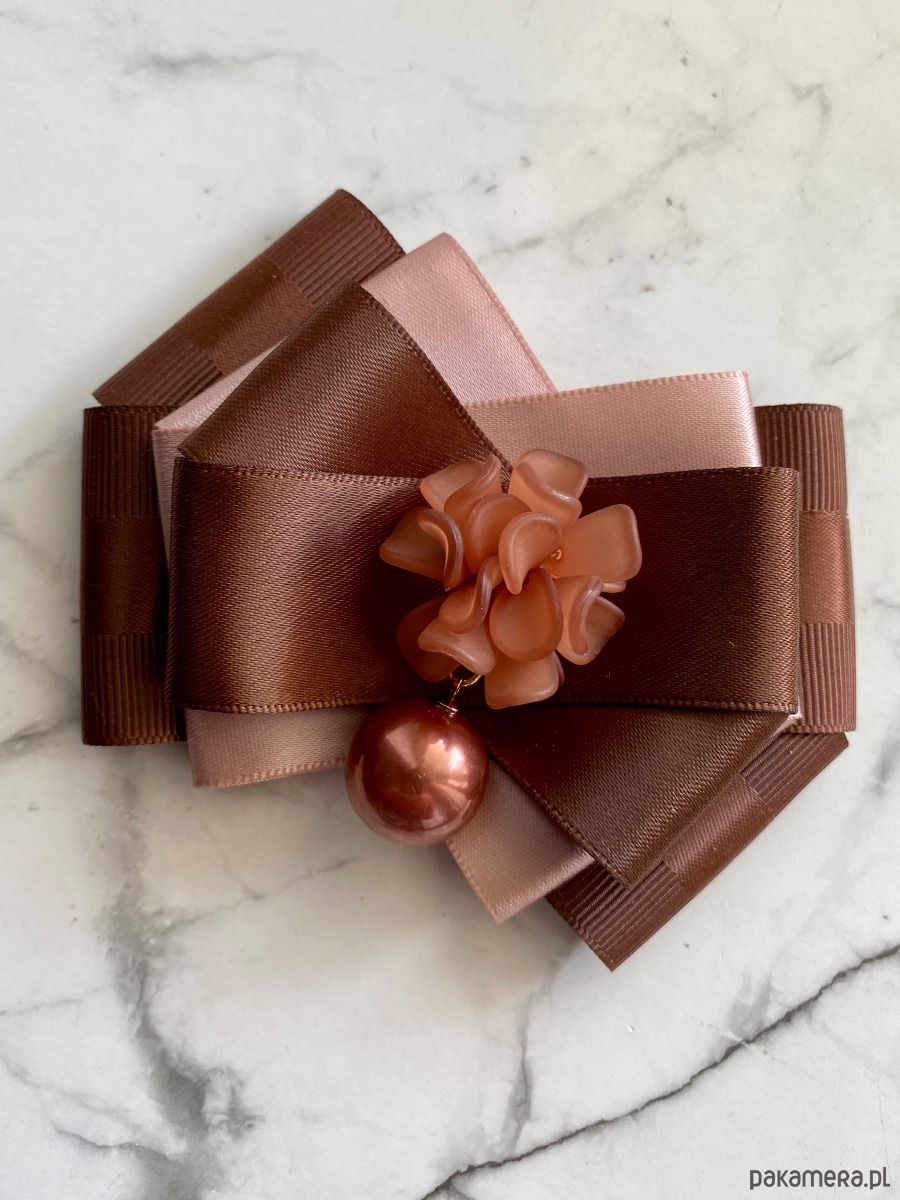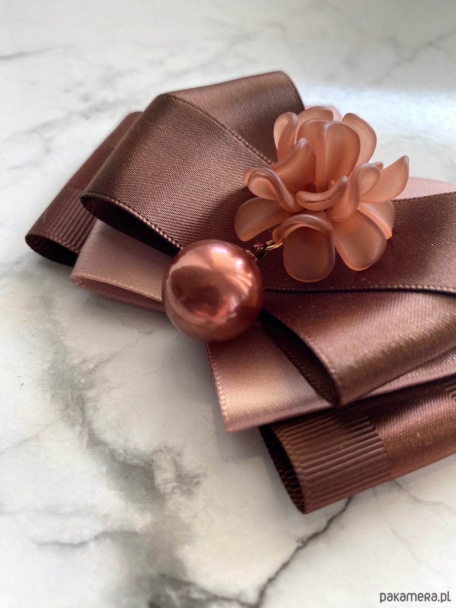 Piękna dekoracyjna ozdoba na środku, kwiaty 3d wykonane z masy a do tego perła, wszystko w cudnym brązowym kolorze.