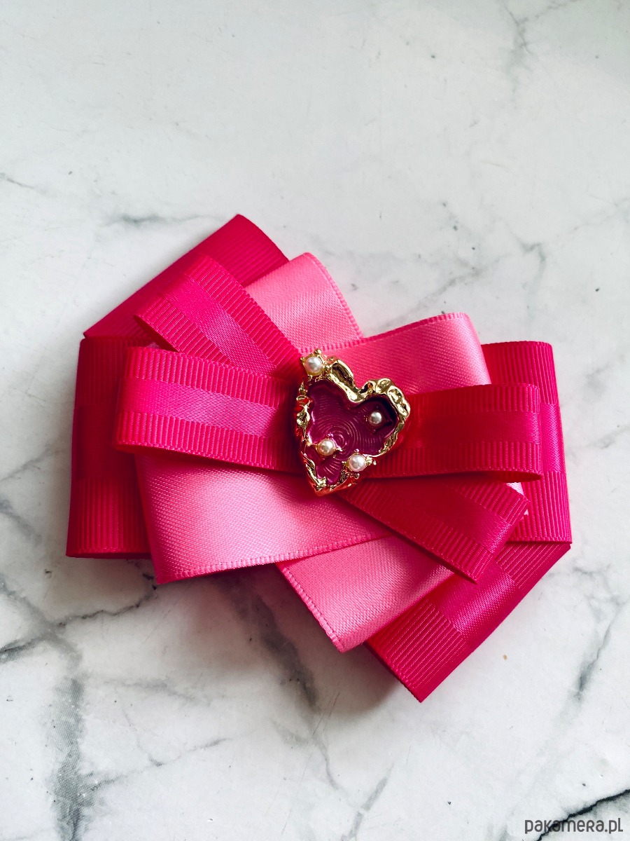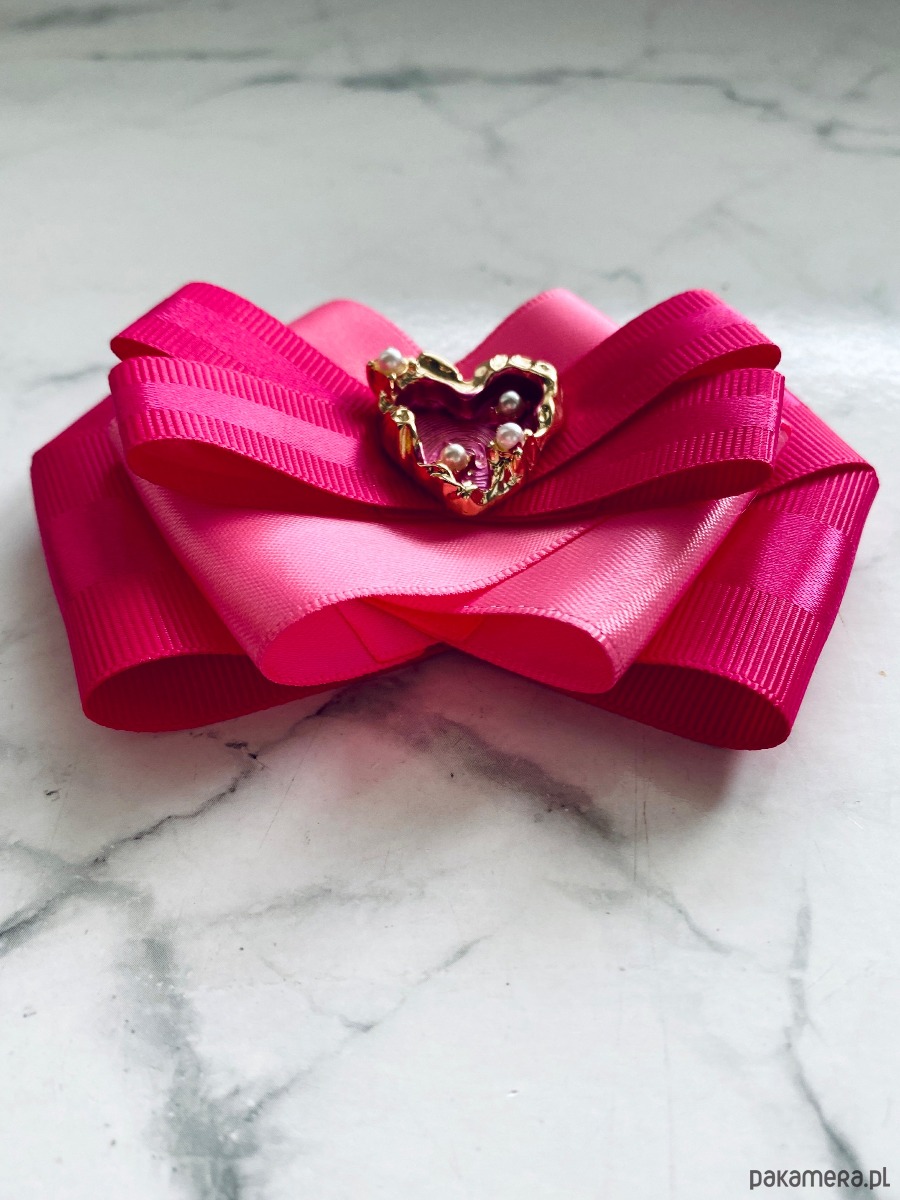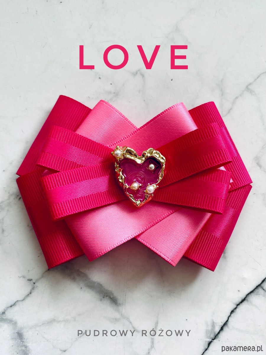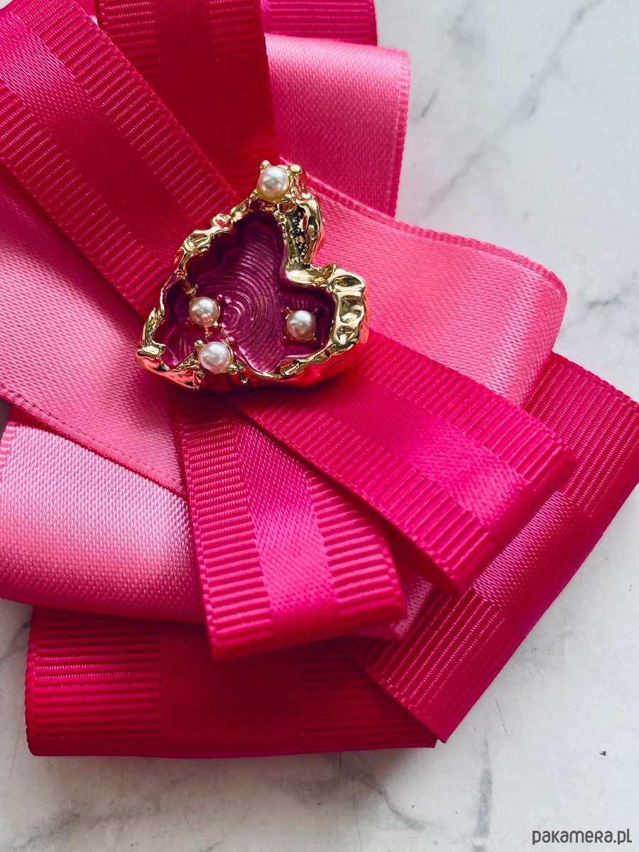 Na środku nowoczesne Serce w stylu ART. Metalowe złote serce z efektem zagłębienia malowane na kolor różowy z efektem odcisku palca i malutkimi perełkami.
