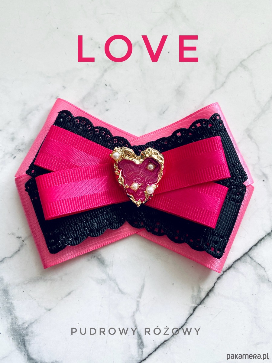 Na środku nowoczesne Serce w stylu ART. Metalowe złote serce z efektem zagłębienia malowane na kolor różowy z efektem odcisku palca i malutkimi perełkami.