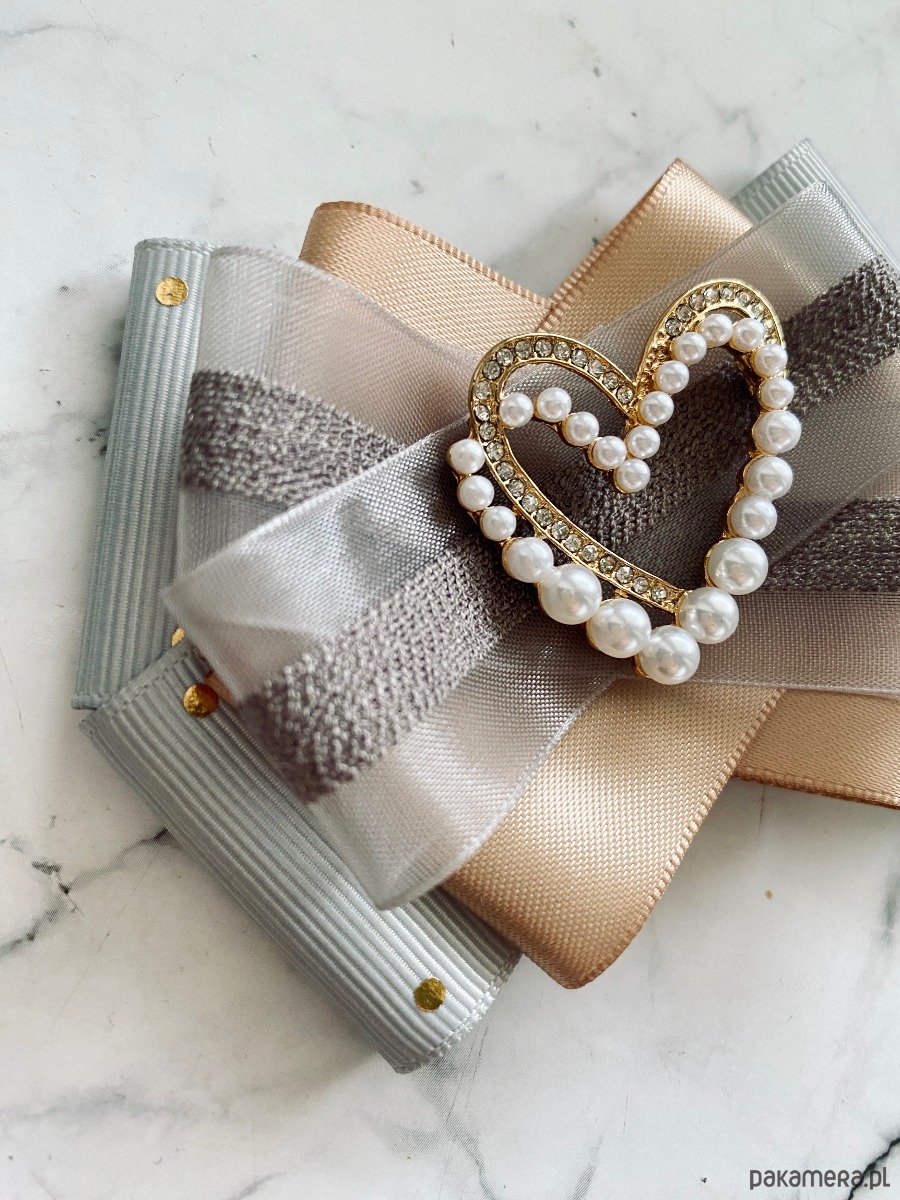 Na środku cudne podwójne Serce, jedno w kolorze złotym drugie wykonane z perełek o różnej wielkosci.