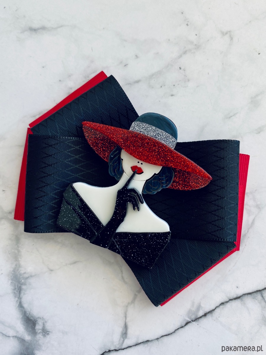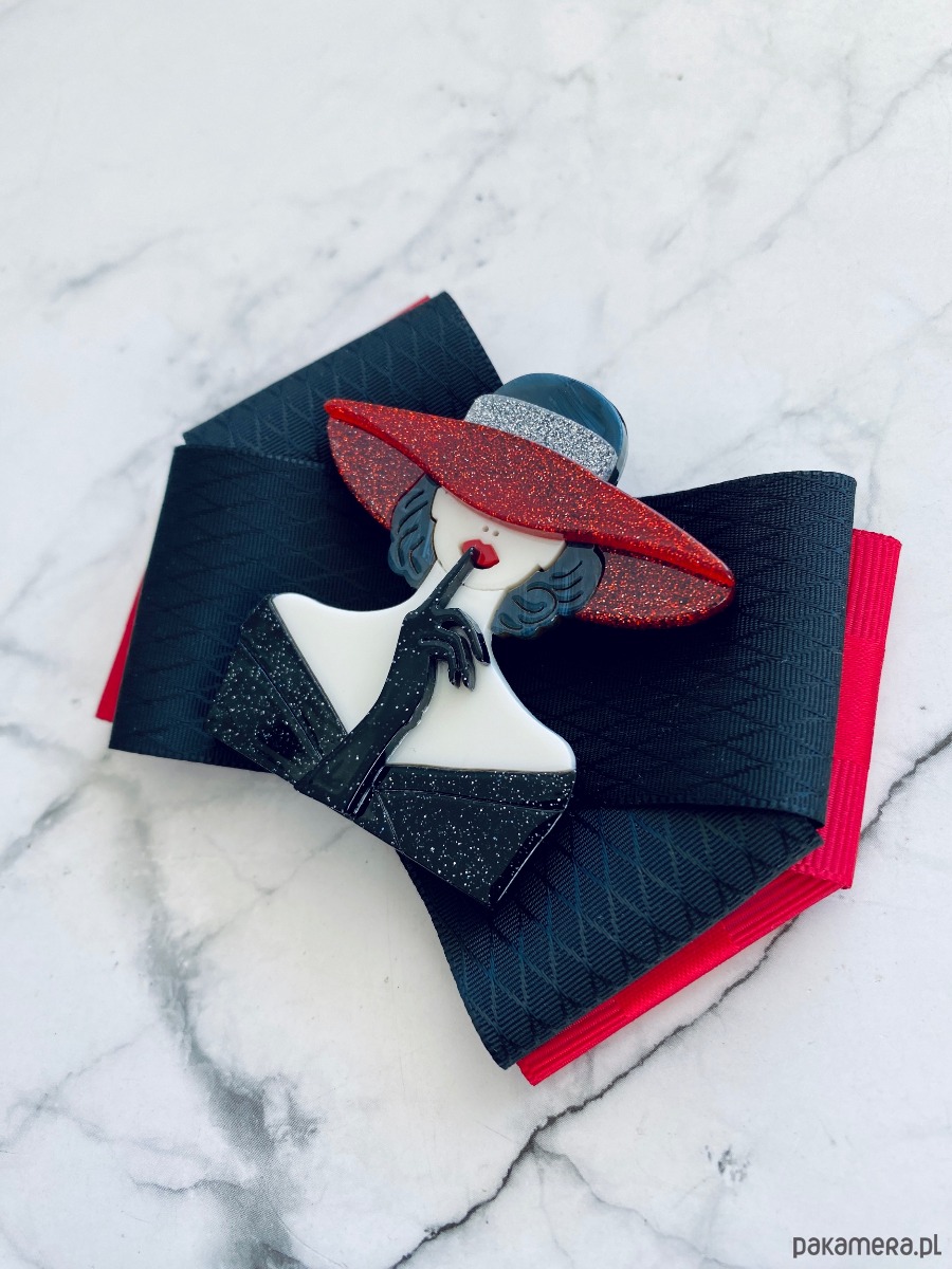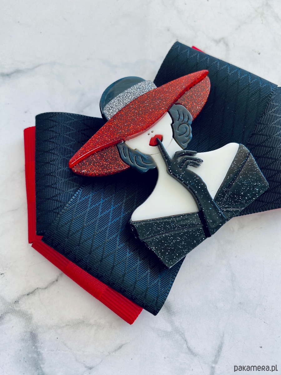Broszka w kolorach czerni , bieli i czerwieni.