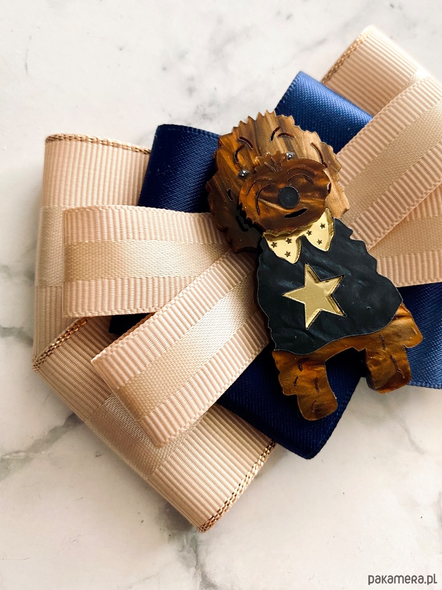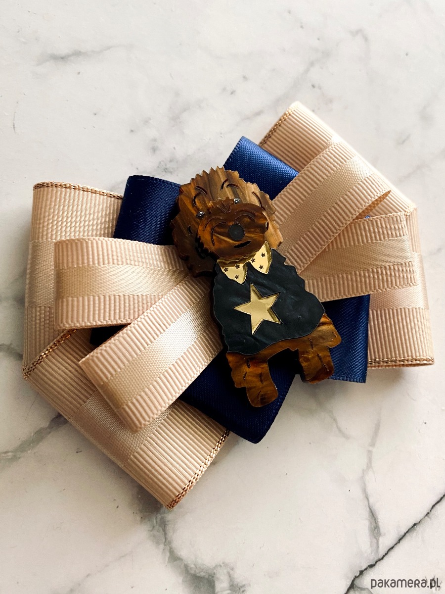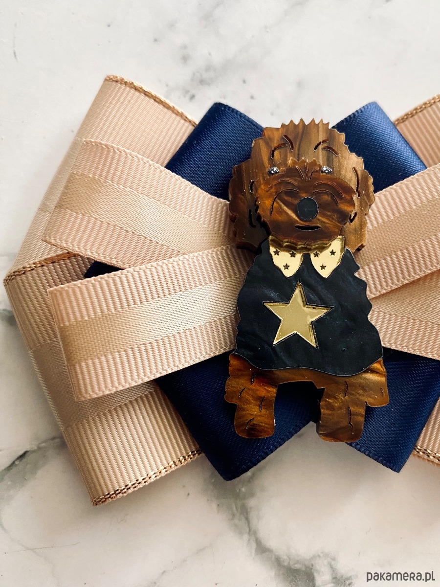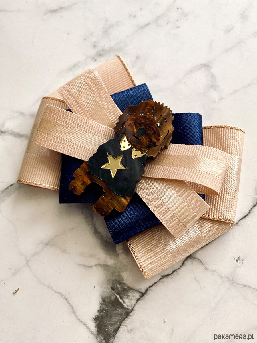 Broszka wykonana z wysokiej jakości taśm i dodatków.