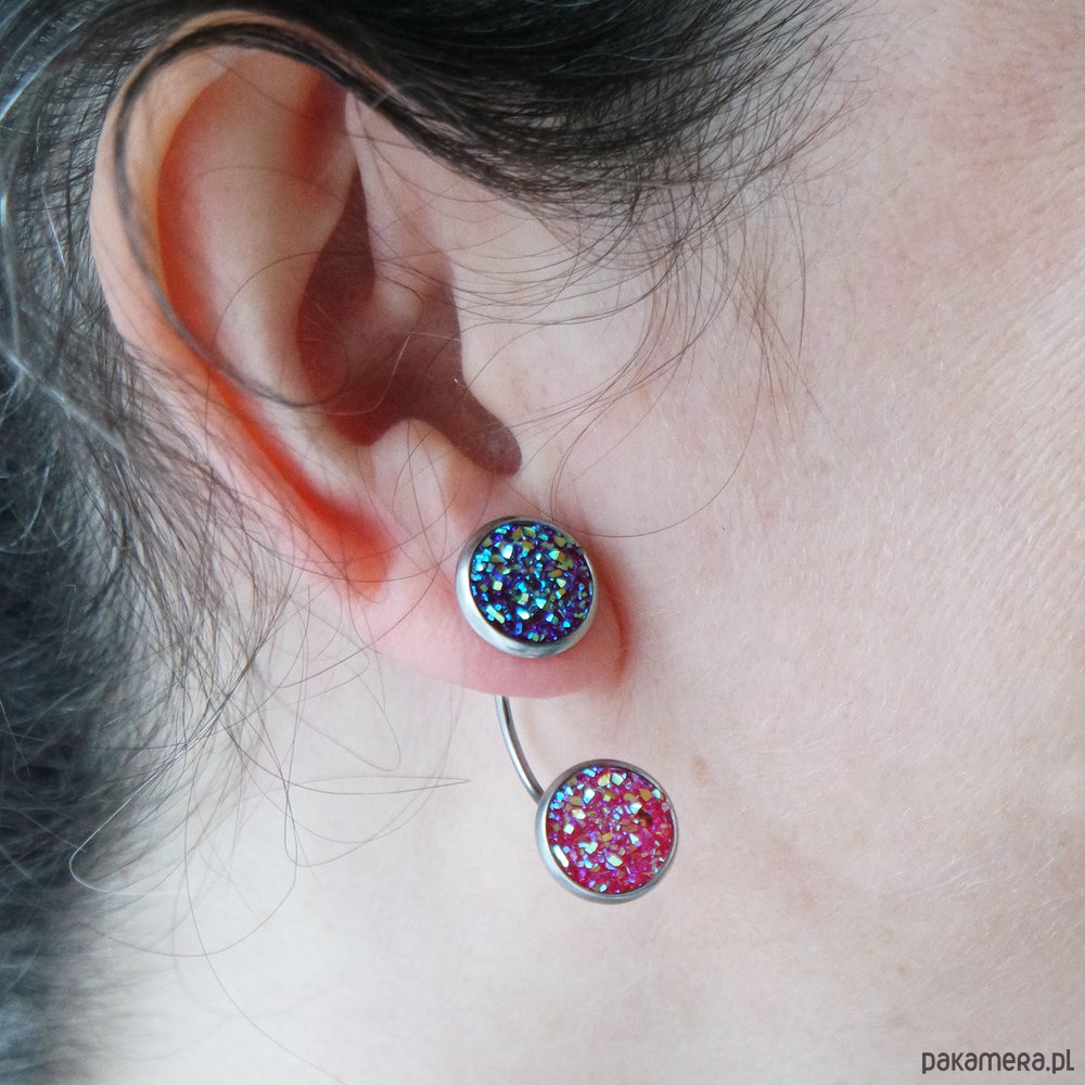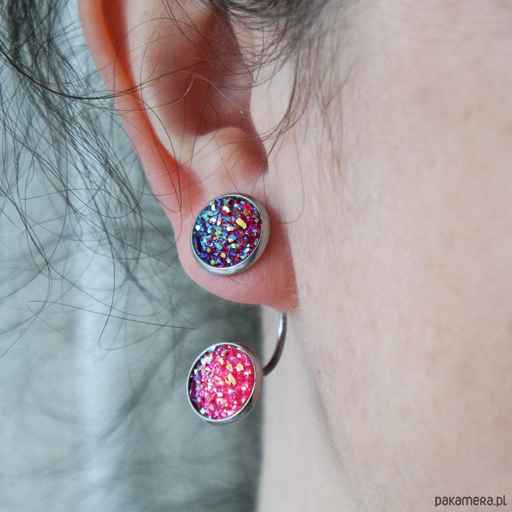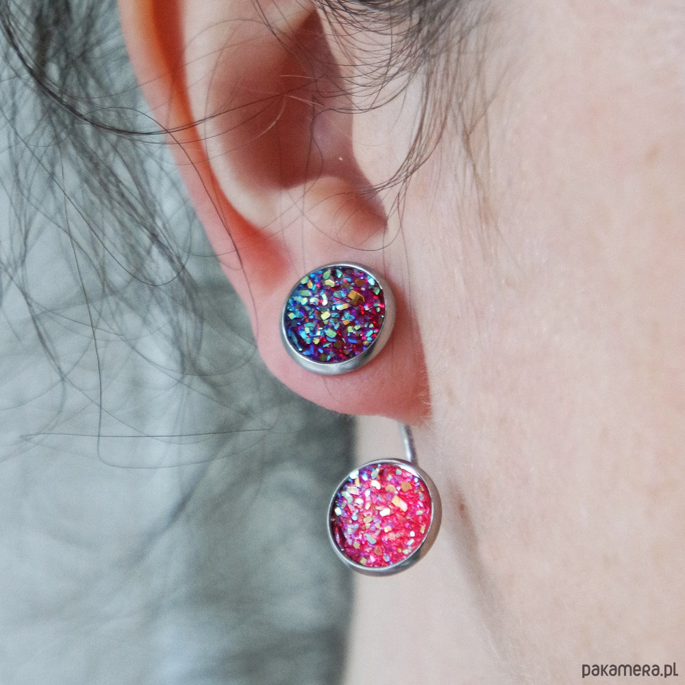 Posiadają zaokrąglone zatyczki z oczkiem z żywicy, można je nosić dowolnie zestawiając kolorystycznie z zatyczkami z oczkiem z żywicy lub nosić jako same kolczyki sztyfty dodając zwykłą zatyczkę (jest dołączona w komplecie).