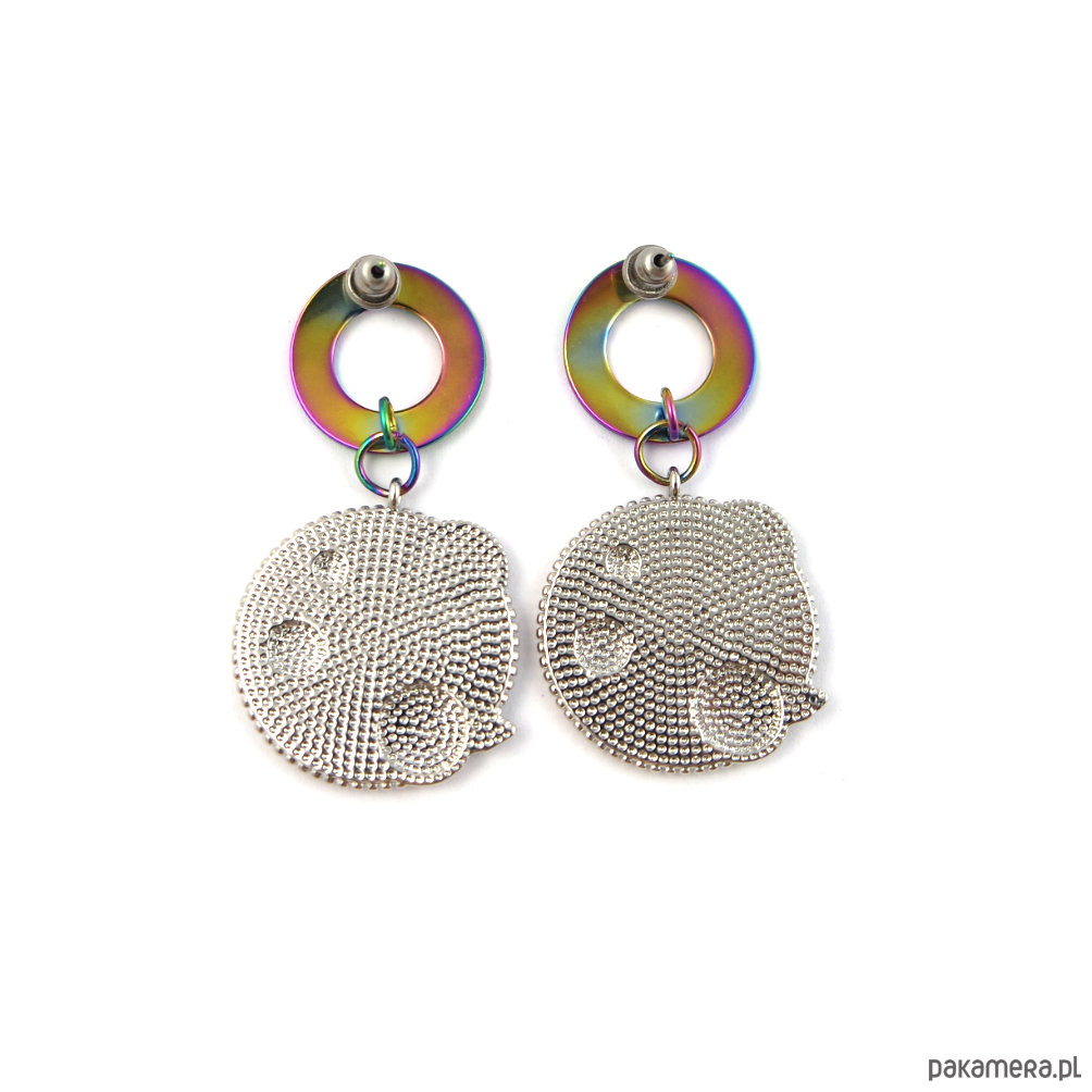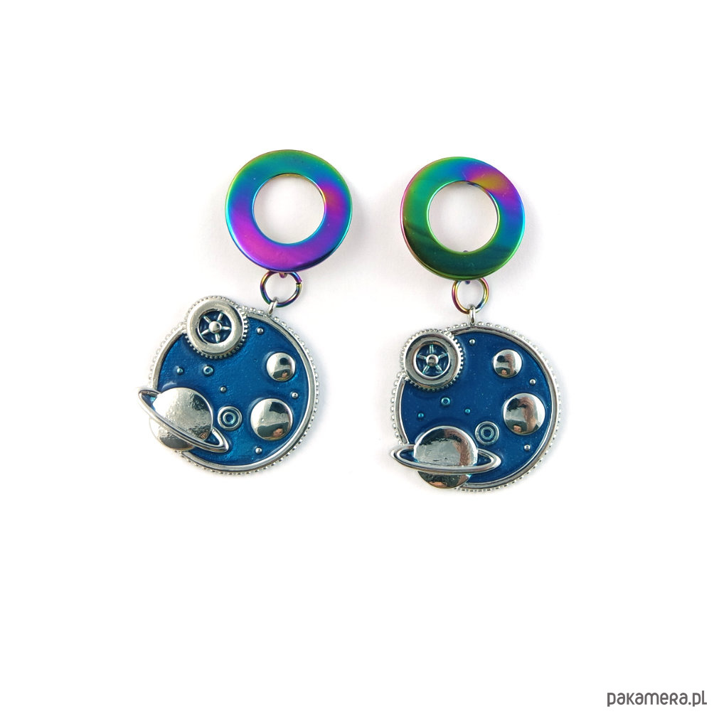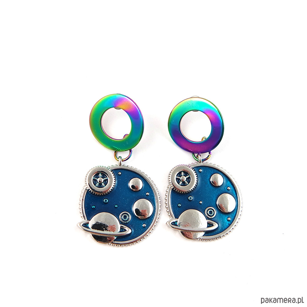 Oryginalne kolczyki z w formie koła oraz emaliowanej zawieszki z kosmosem.