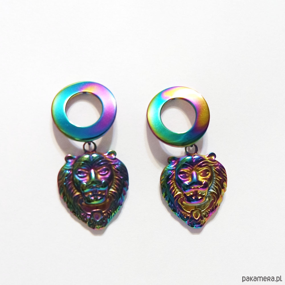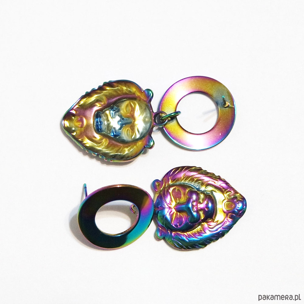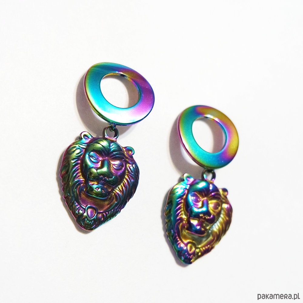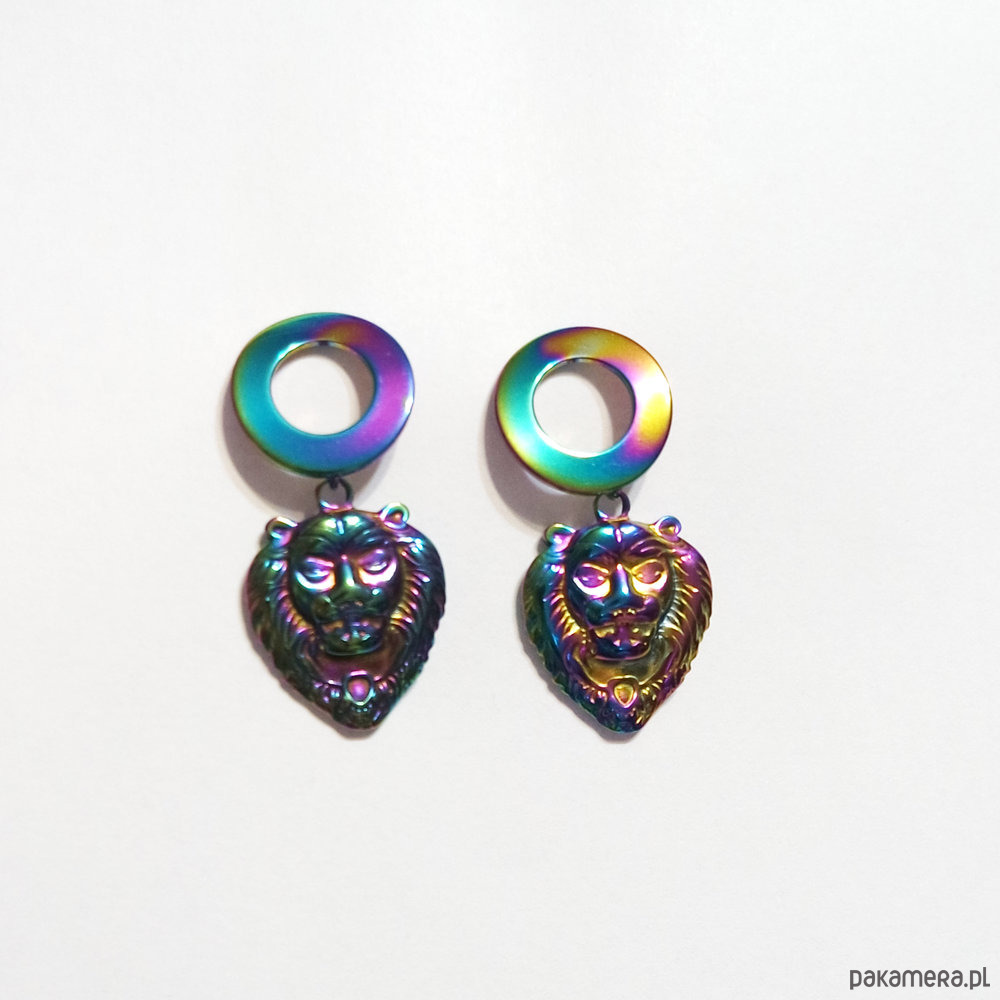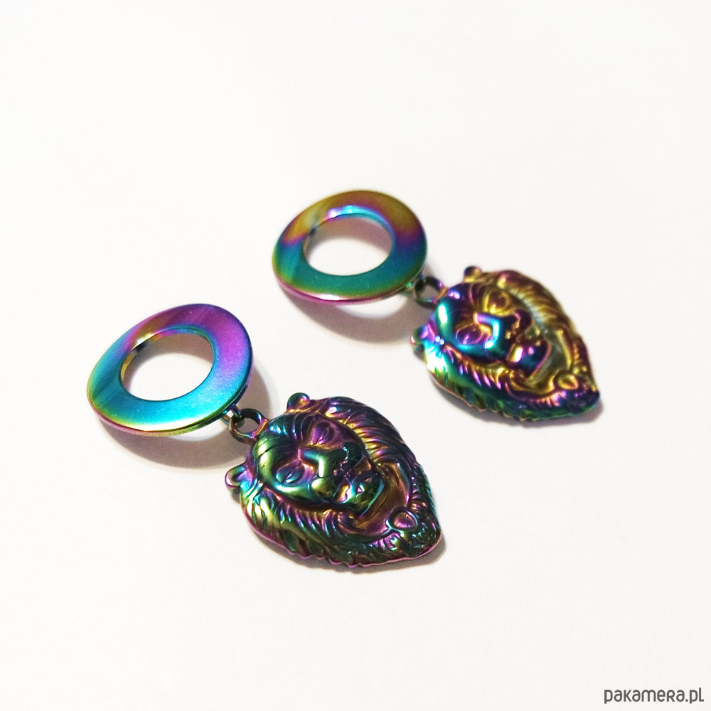 Oryginalne kolczyki z w formie koła oraz zawieszki z lwem.