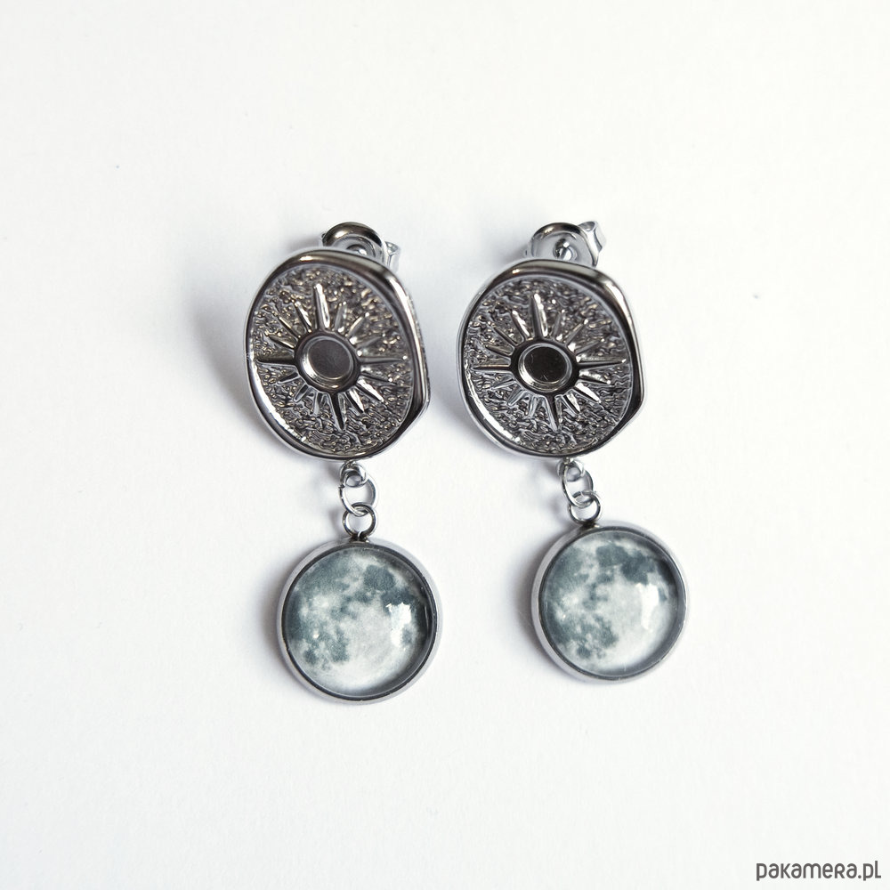 Oryginalne kolczyki w formie sztyftów ze słońcem oraz zawieszki z grafiką z księżycem.