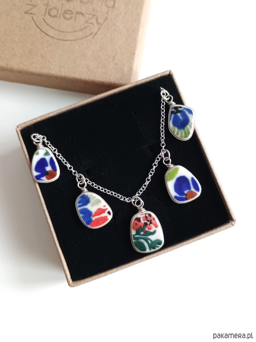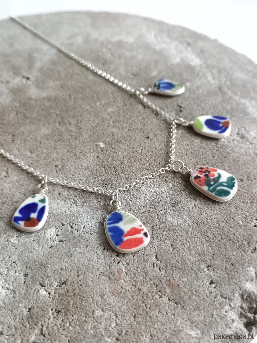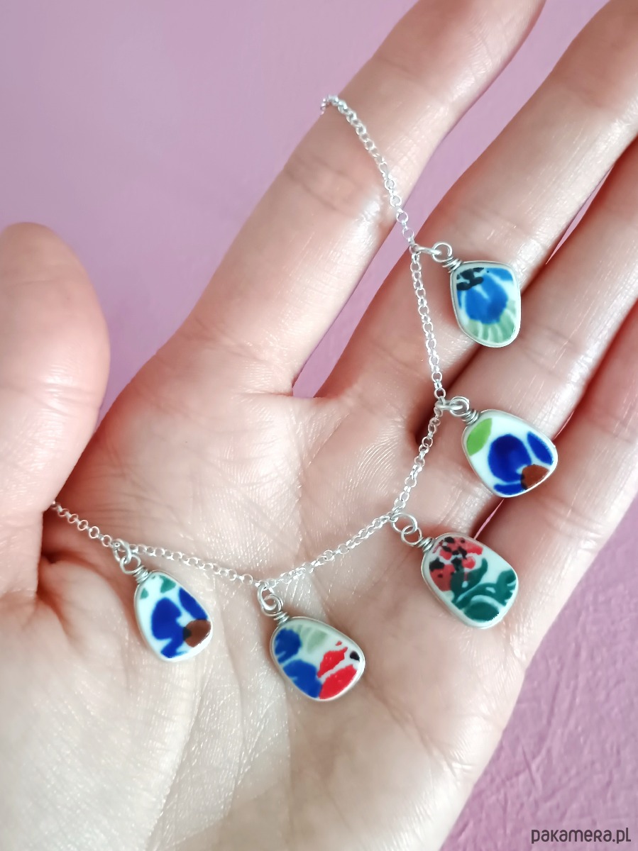 Ceramika w Bolesławcu i jego okolicach produkowana była już w XIV wieku. Do dziś najważniejszy surowiec, czyli glina wydobywany jest na miejscu, a tradycja wyrobu naczyń ceramicznych, rozwijana i kultywowana przez wieki - trwa. Bolesławiec jako marka, tworzona przez kilkadziesiąt różnych manufaktur, znana jest na całym świecie, a charakterystycznego wzoru w kobaltowe kropki nie sposób pomylić z żadnym innym. Co najbardziej wyróżnia Bolesławiec, to że szkliwo nakładane jest ręcznie, za pomocą stempelków z gąbki. Oto kolia - naszyjnik wieloelementowy, który wykonałam z fragmentów ceramiki bolesławieckiej. Fragmenty, czyli zawieszki oszlifowałam w nieregularne kształty, oprawiłam w drucik i połączyłam z łańcuszkiem (oprawa i łańcuszek ze srebra próby 925). Ceramikę zeszlifowałam również z grubości - jest cieńsza niż pierwotnie, dzięki czemu zawieszki nie są masywne. Brzegi i tył pokryłam lakierem, co sprawia, że nie brudzą się i nie chłoną wilgoci. Wymiary elementów ceramicznych: od 9 x 12 do 11 x 14 mm. Ilość zawieszek: 5 sztuk. Długość łańcuszka w całości: 45 cm. Unikat - każdy z moich wyrobów występuje w jednym egzemplarzu. Upcykling - nie reprodukuję wykorzystywanych wzorów, niczego nie domalowuję - wykorzystuję wyłącznie oryginalne naczynia i motywy, które się na nich znajdują.